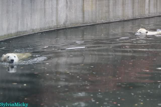 Im Wasser war er auch. Beobachtet von Tosca, die auch im Wasser war. Für einige Minuten schwammen sie zusammen. Zuerst Knut und hinter ihm Tosca.