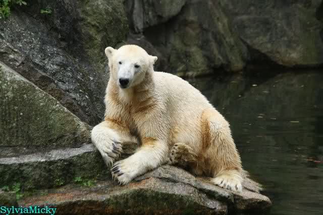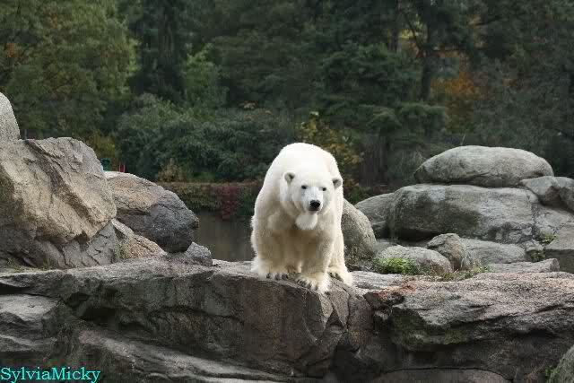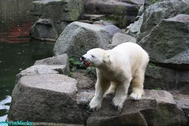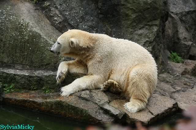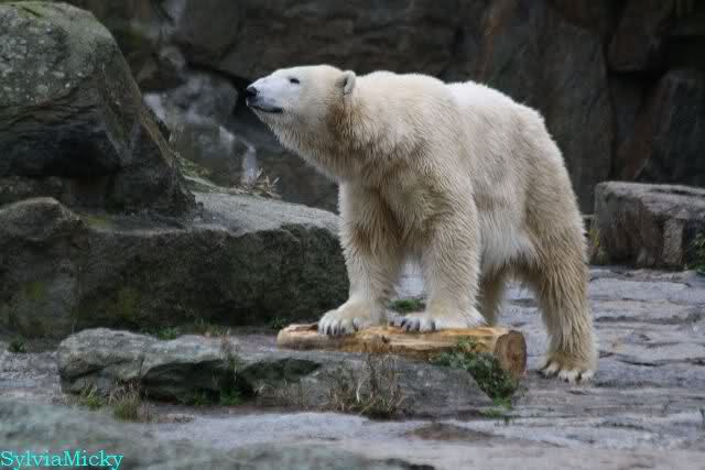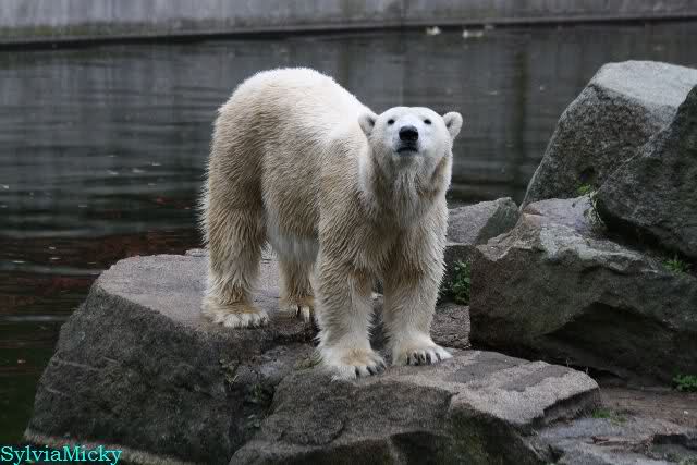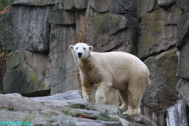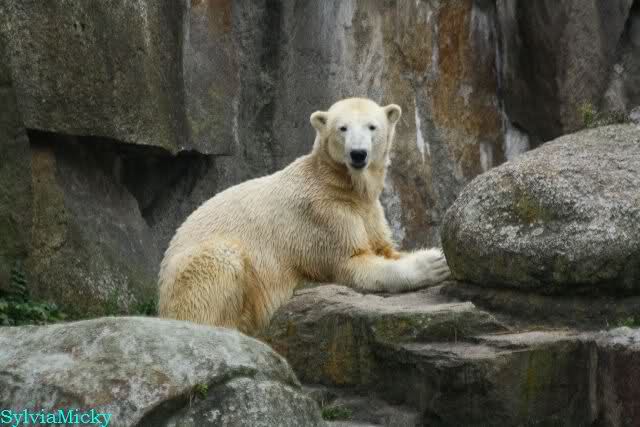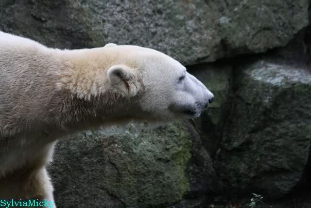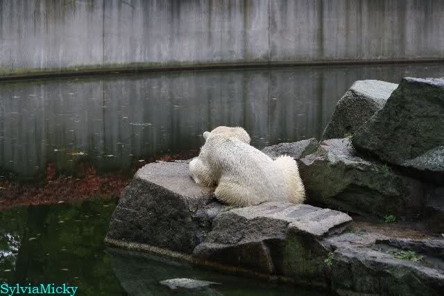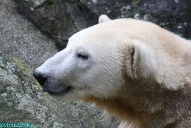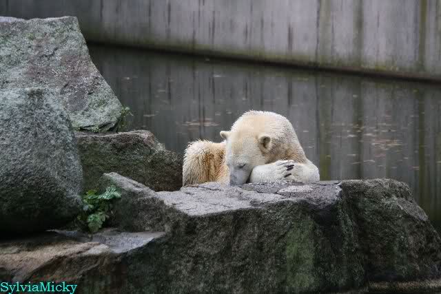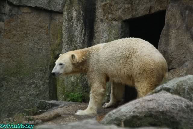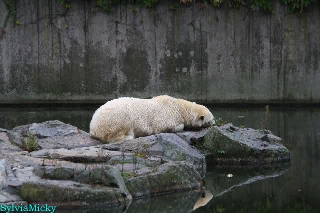 Als ich den Zoo verließ, lag Knut wieder auf seiner rechten vorderen Ecke, Tosca auf der linken Insel, Kati stand in ihrer Höhle und Nancy lag auf der Anlage.