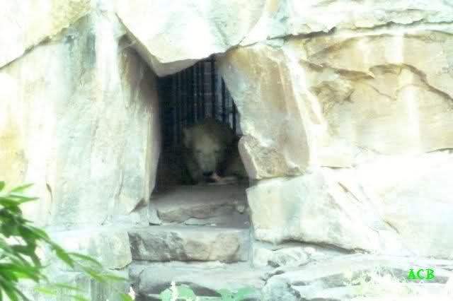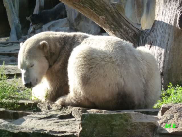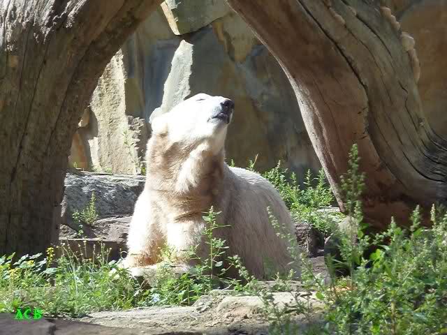 Als wir kurz vor elf den Zoo betraten, begann es zu regnen. Nicht sehr heftig, aber unangenehm. Trotzdem machten wir uns unverdrossen auf den Weg zu Knut. Der hatte sich ordentlich geschminkt, wie es sich gehört und lag schlafend in seiner Kuhle. Er hatte an uns wenig Interesse. Das machte nichts; auch mein Enkelsohn hatte kein Interesse. Er schlief nämlich. Naja, was nicht ist, kann ja noch werden.