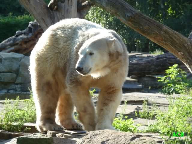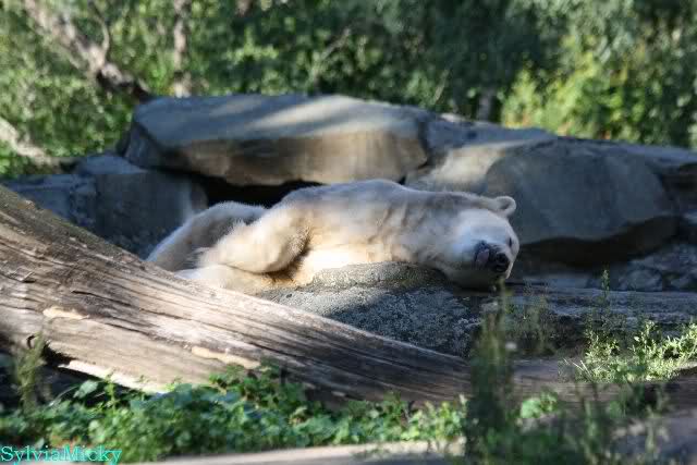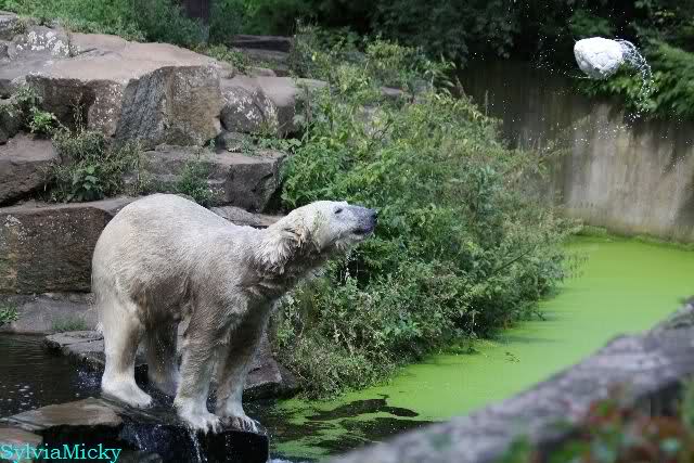 Am Vormittag lag Knut auf dem Stein und schlief. Es scheint sein neuester Lieblingsplatz zu sein. Gegen Mittag schwamm er im Wassergraben. Er spielte erst Ball mit sich. Knut habe ich nicht gesehen aber der Ball flog immer nach oben. Später spielte er auch mit den wieder sehr zahlreichen Besuchern.