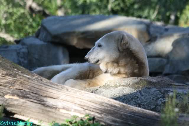 Nach der Fütterung von Knut ging ich gemeinsam mit einigen Knut-Freundinnen noch eine kleine Runde. Zuerst zu den Wölfen. Alle sieben Wölfe waren draußen. Die Jungen sind nun schon richtig groß und kaum noch von ihrer Mutter zu unterscheiden. Die Mutter ist ja auch noch eine sehr junge Wölfin.