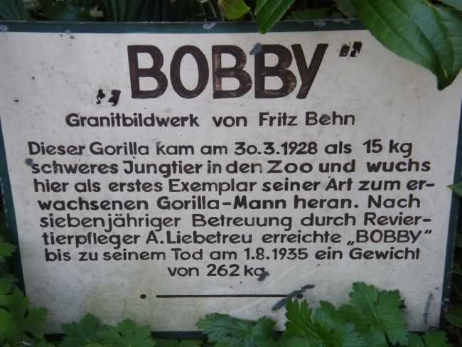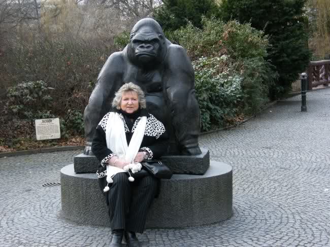 Bobby wurde ein Denkmal gesetzt; kurz hinter dem Elefantentor, wenn der Besucher sich bereits im Zoo Berlin befindet, sieht man den lebensgroßen Gorilla. Er wird oft fotografiert, so habe auch ich mich zu Bobby`s Füßen gesetzt und knipsen lassen. Ich nannte das Foto: "King Kong und die weiße Frau"!