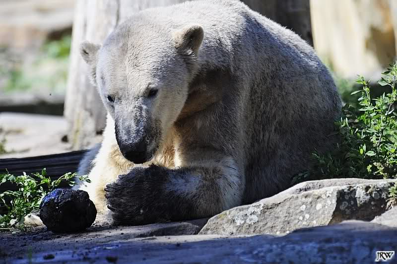 Eine Knutfreundin hatte eine Eisbombe für Knut liebevoll zusammengestellt. Es war erstaunlich, was er immer wieder Neues mit einer Eisbombe anstellen konnte. Er knabberte daran, trug sie herum und letztendlich wälzte er sie im schwarzen Sand. Besucher, die später kamen, konnten nicht erkennen womit er spielte, so schwarz waren die Überreste geworden. Seine Pfote, mit der er sie ein- und wieder ausbuddelte war rabenschwarz. Er beschäftigte sich stundenlang mit seinem Geschenk. Irgendwann trug er die Reste der Eisbombe zum Wasser, spülte sie ab und verspeiste den Rest. Das war typisch Knut. Eben ein Zauberbär!