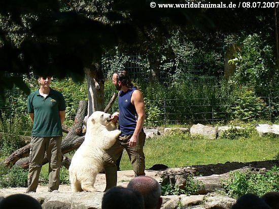 Lange Schlangen an den Kassen, ganz wie in alten Zeiten. Dieses Bild bot sich am Eingang des Berliner Zoos. Der Run auf Knut ist ungebrochen. Zur 14 Uhr *Knut-Show* war die Schlange der Besucher über hundert Meter lang. Hier nun einige Fotos von der 14 Uhr Präsentation. Heute war wieder der jüngere Pfleger dabei, er hatte Urlaub und war trotz seines freien Tages heute schon mit im Gehege, da er in den nächsten beiden Tagen Thomas Dörflein vertritt, der zwei Tage in Urlaub geht.