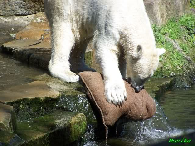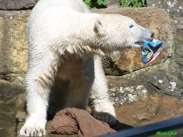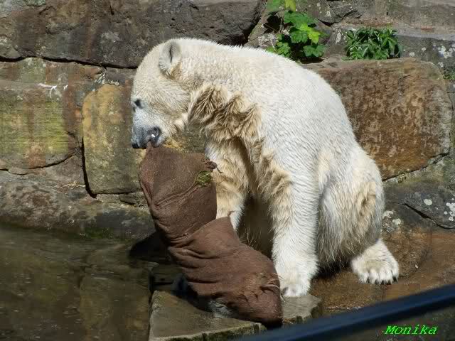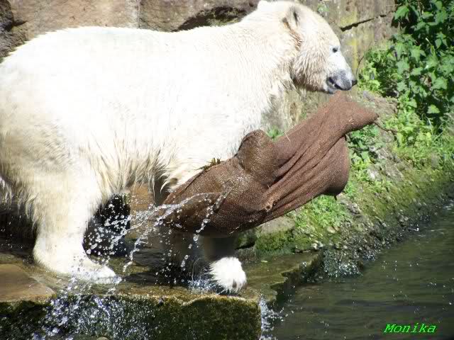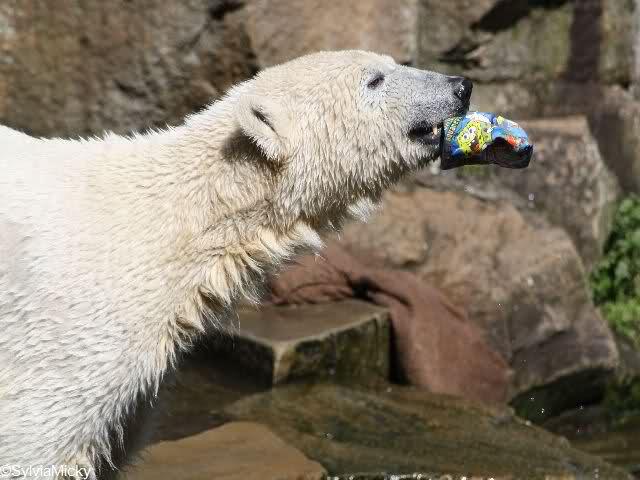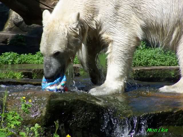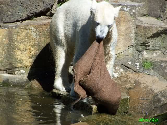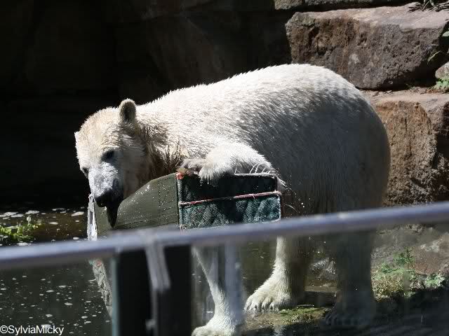 Heute Vormittag war Knut im Wasser und spielte mit seinem Nackthuhn und dem Schlauch. Dann fischte er einen gefüllten Jutesack aus dem Wasser, der solange bearbeitet wurde, bis der Inhalt zum Vorschein kam. Ein schon ziemlich zusammen gepresster Ball, der aber schwungvoll zu den Zuschauern geflogen ist.