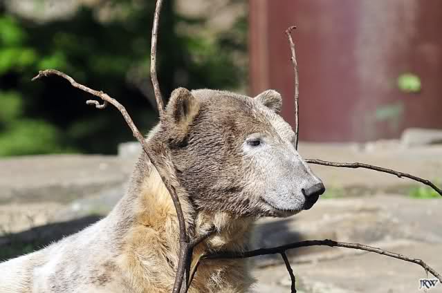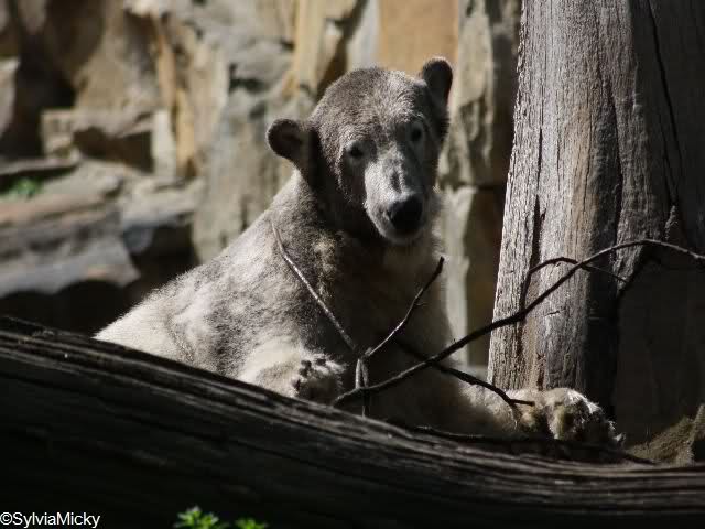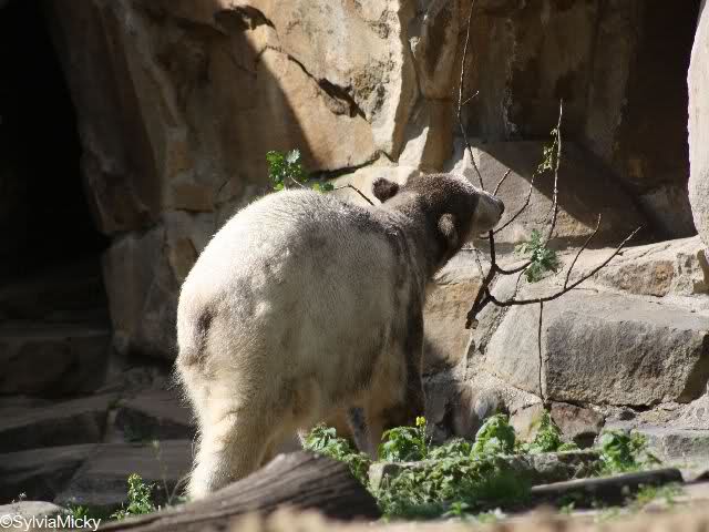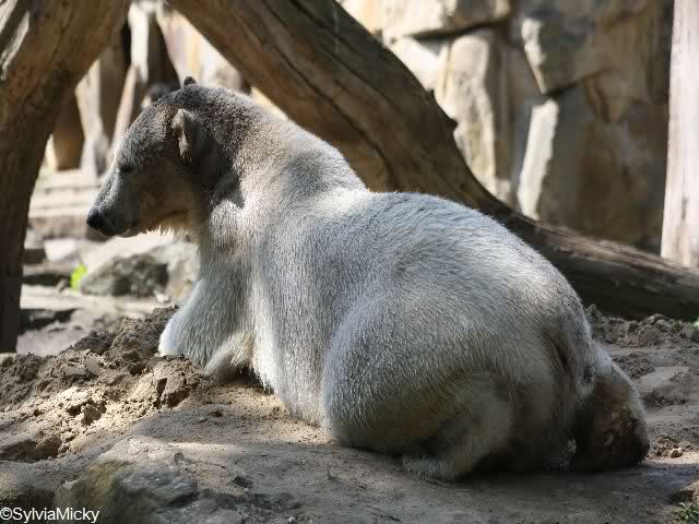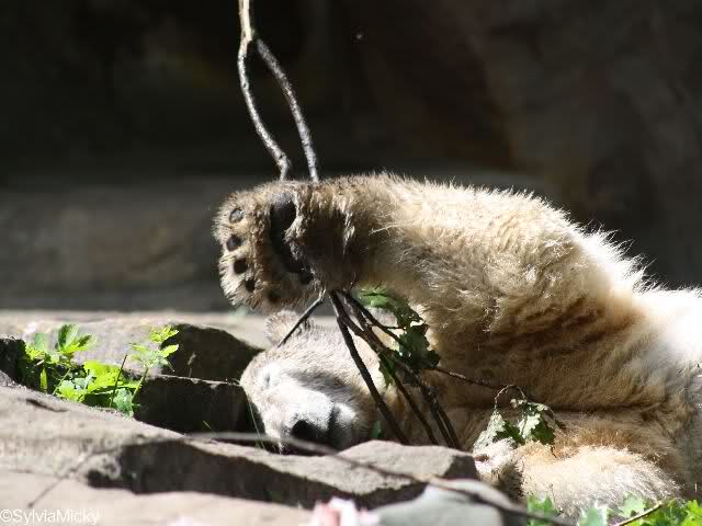 Bei den Braunbären saß Berni heute auf seinem Allerwertesten, die Hinterbeine ausgestreckt, und wartete darauf, dass ihm die Pflegerin etwas in den Schoß warf. Was daneben fiel, wurde zunächst ignoriert. Nur nicht zuviel bewegen! Ruhe ist dem Bären heilig. Aber dem alten Herrn mit seiner Arthrose kann man das schon nachsehen.
