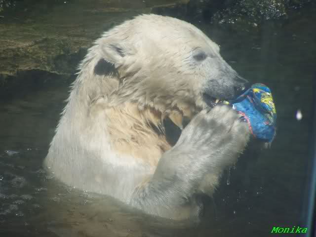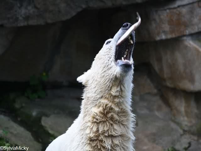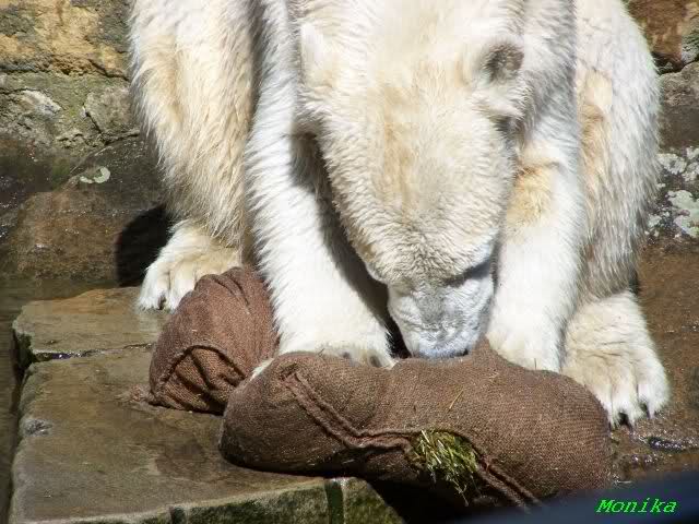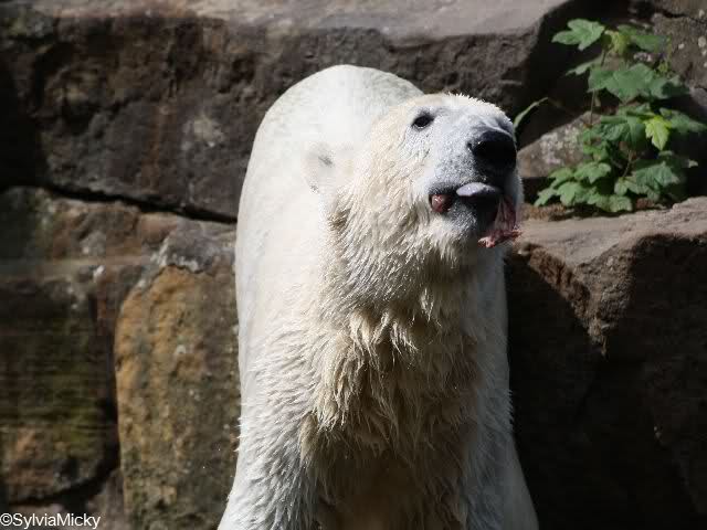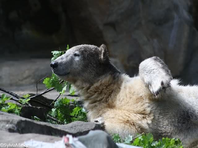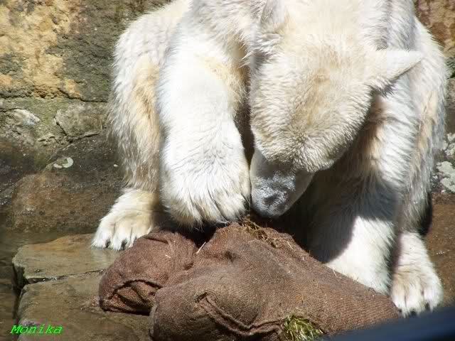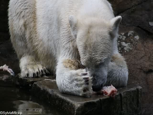 Knut indessen jieperte nach seinem Futter, dass ihm dass Wasser im Mund zusammen und auch heraus lief. Er lebte heute auch wieder sehr gut, so wie immer. Fleisch, Fisch, Weintrauben, Birnen, Bananen und ein halbes Rosinenbrot. Zwischendurch wurde Frau Weckert immer noch das eine oder andere Brötchen oder Croissant gereicht, dass dann auch im Bärenmagen verschwand. Den Höhepunkt bildete ein großer Fisch, vielleicht von dem netten Herrn, der mittwochs immer einen Fisch mitbringt?