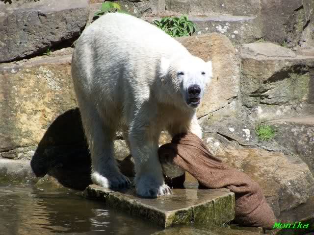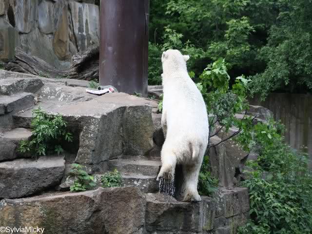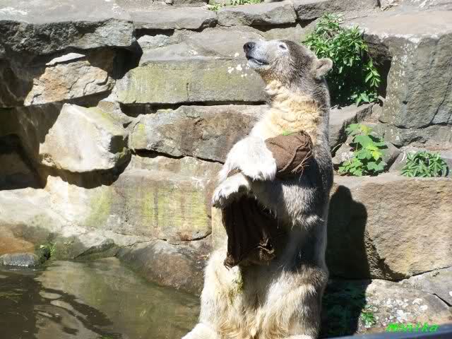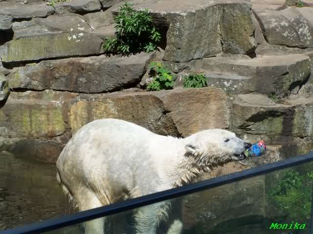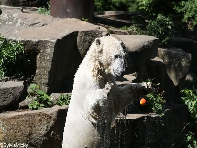 Also ging ich wieder zurück zu Knut. Der spielte immer noch im Wasser mit seinem Aussie-dog. Im Zoo kann man wirklich in Stress geraten: Knut auf der einen Seite, die anderen Tiere auf der anderen Seite. Ich versuchte es mit dem goldenen Mittelweg: Erst mal eine Zoo-Runde, dann zurück zu Knut.