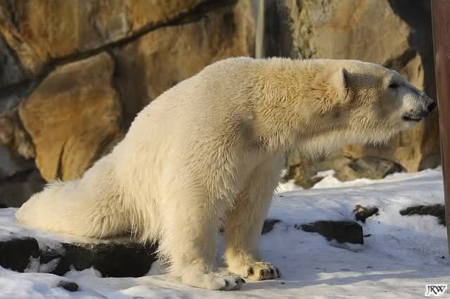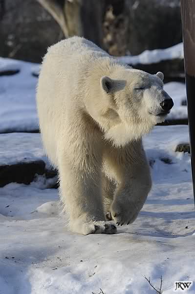 Wenn’s weiter so frostig bleibt, sollte ich vielleicht doch unserm Weißbär, äh Eisbär Knutili mal endlich einen Besuch abstatten. Bei diesen Temperaturen müßte er eigentlich aufleben und vor Lebensfreude nur so quietschen. Echtes Knut-Wetter eben, aber immerhin heute mit ausgiebig Sonnenschein. Stelle mir vor, daß der beliebteste Berliner derzeit weltweit, wie naarrisch im Schnee herumtoben wird, irgendeim komischen Gegenstand hinterherrennt, eim Eimer, eim Weihnachtsbaum oder eim alten, löchrigen Sack, denn der Schnee dürfte bei ihm starke Sehnsuchtsbilder nach der nie gekannten Urheimat auslösen, nämlich nach dem alles überdeckenden Weiß, in dem er dann fast vollständig aufgeht, weil er mit dem Weiß ringsum verschmilzt, ja Teil wird und sich damit nicht mehr nackt fühlen muß - denn in hiesigen Breiten bleibt für gewöhnlich für alle auf weite Entfernung bestens erkennbar wie ein weißer Pudel.
