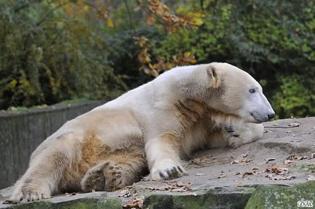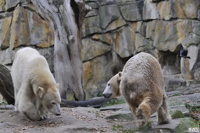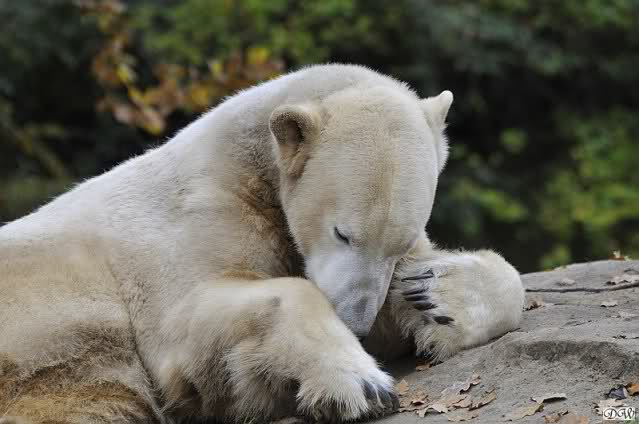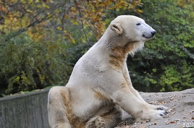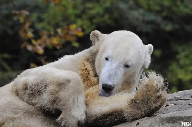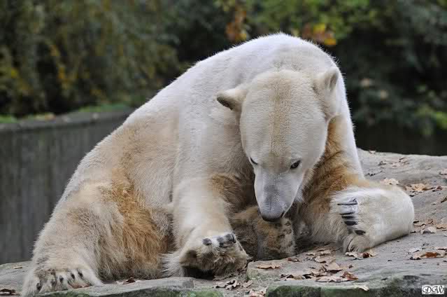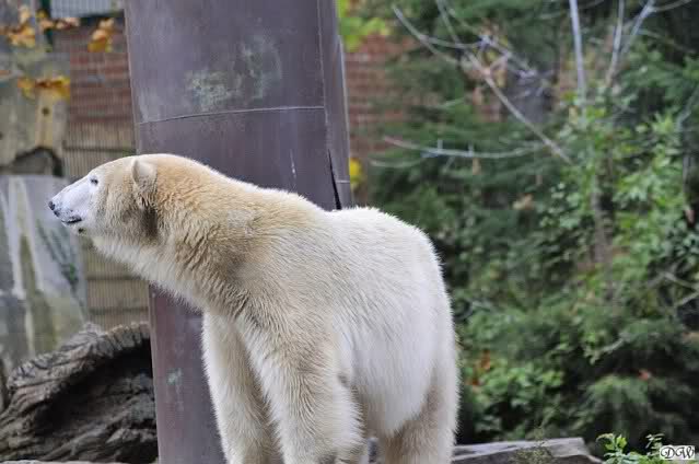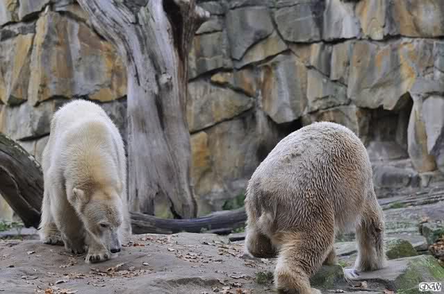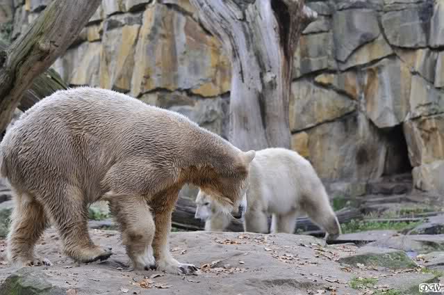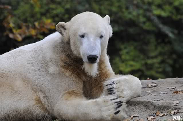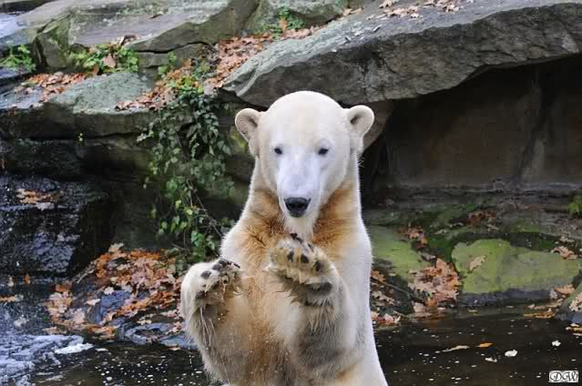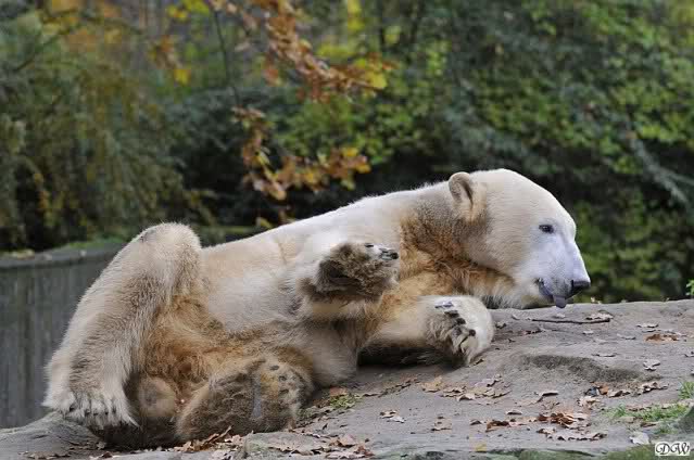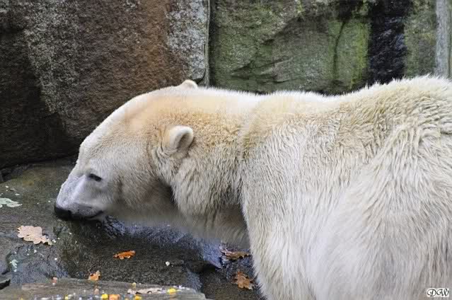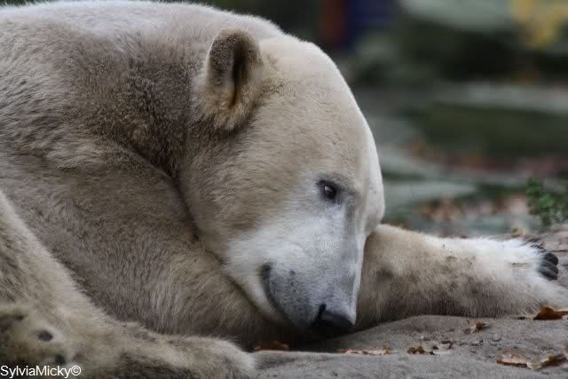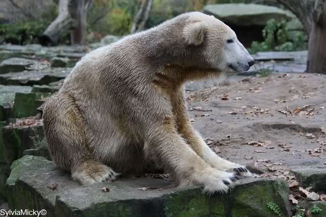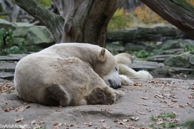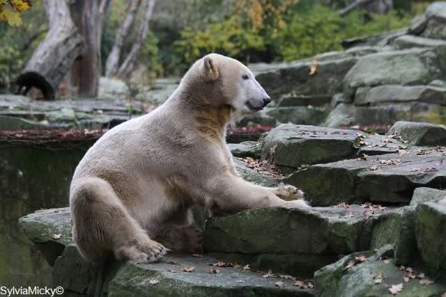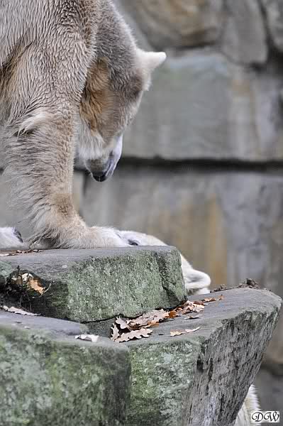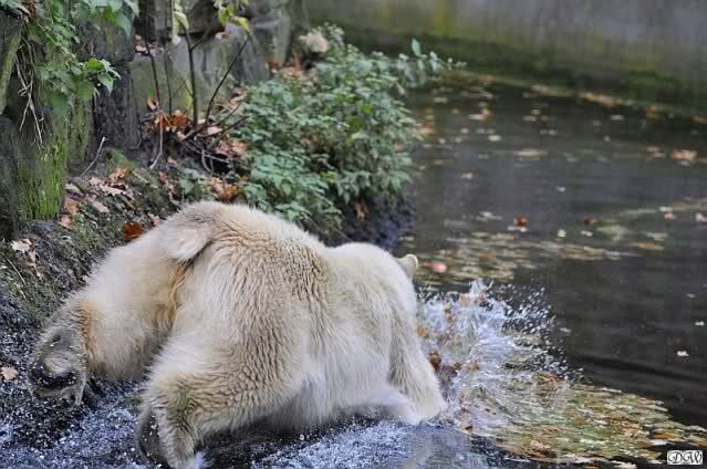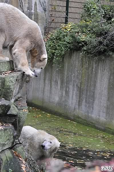 Heute Vormittag schmusten Knut und Gianna lange miteinander. Sie im Wasser und er oben. Gegen Mittag lag Knut auf dem inzwischen betoniertem Sandhügel und Gianna unterm Baum. Nach der Fütterung dauerte es ewig lange, bis Gianna ins Wasser ging. Knut betrachtete sie völlig erstaunt und setzte sich auch mal hin, weil es ihm zu lange dauerte. Gianna versuchte wie Knut das Restfutter mit der Pfote ran zu holen.