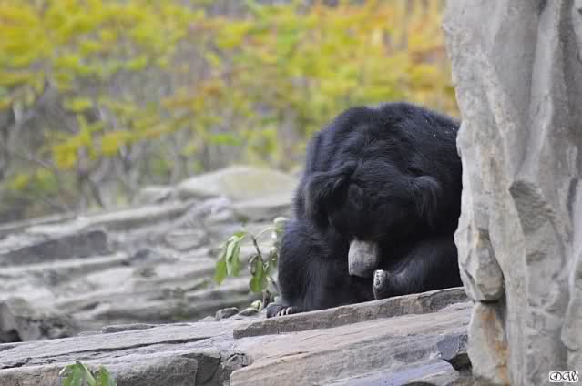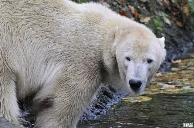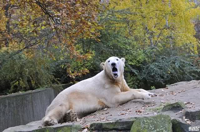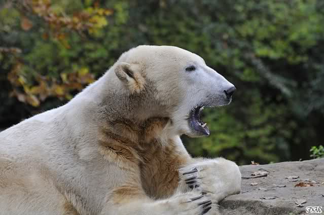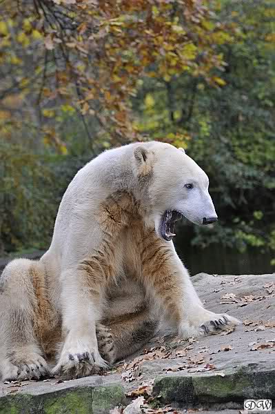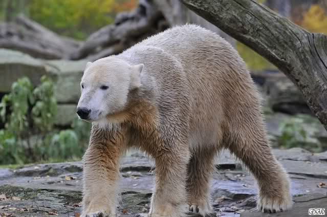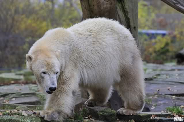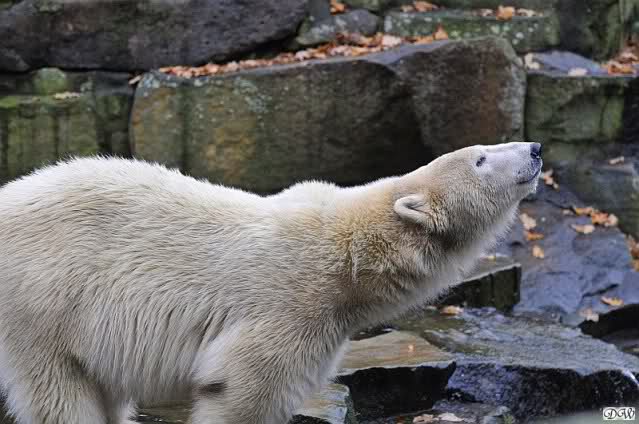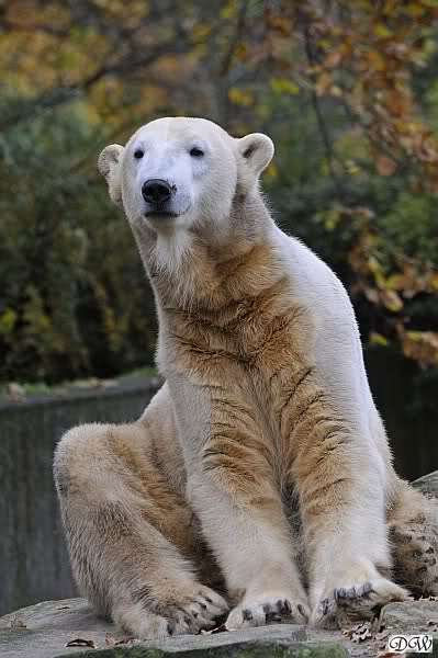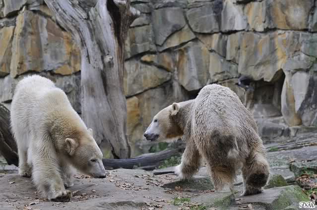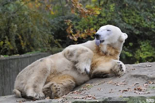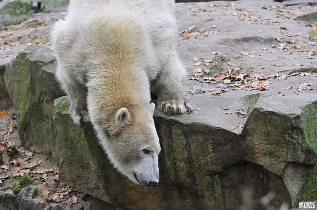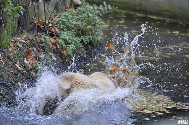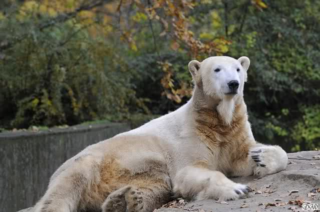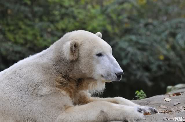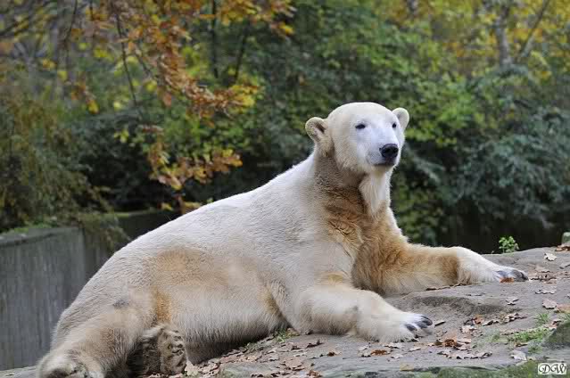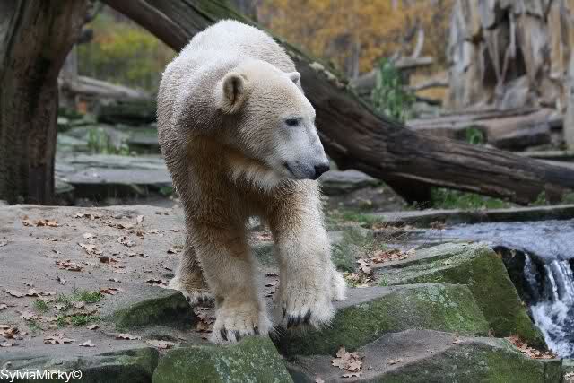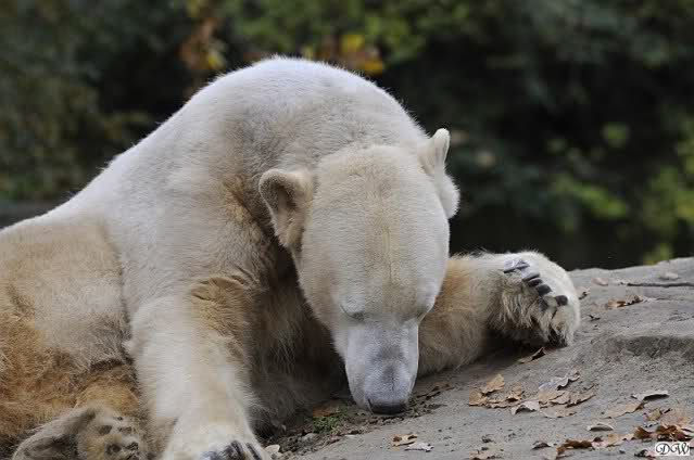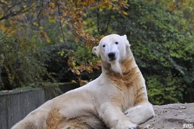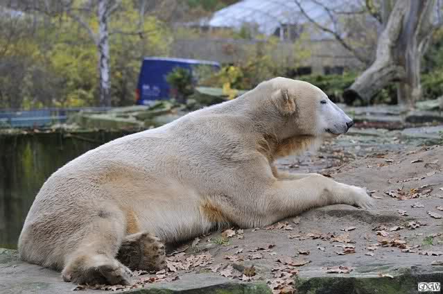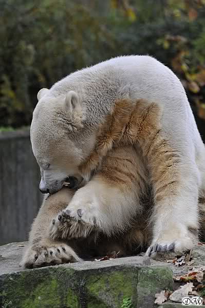 Heute Vormittag schmusten Knut und Gianna lange miteinander. Sie im Wasser und er oben. Gegen Mittag lag Knut auf dem inzwischen betoniertem Sandhügel und Gianna unterm Baum. Nach der Fütterung dauerte es ewig lange, bis Gianna ins Wasser ging. Knut betrachtete sie völlig erstaunt und setzte sich auch mal hin, weil es ihm zu lange dauerte. Gianna versuchte wie Knut das Restfutter mit der Pfote ran zu holen.