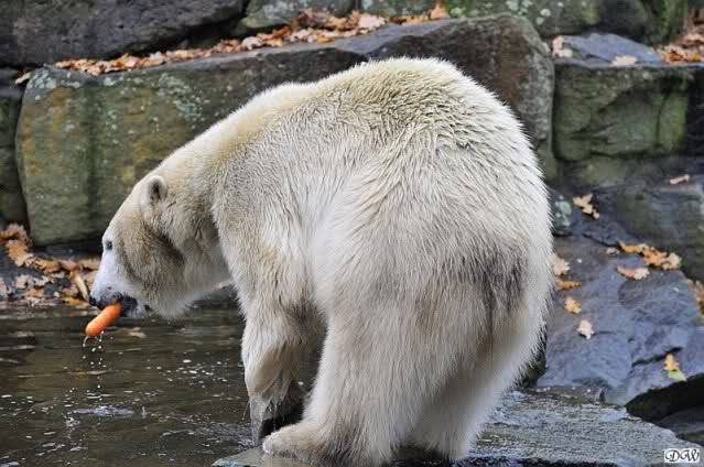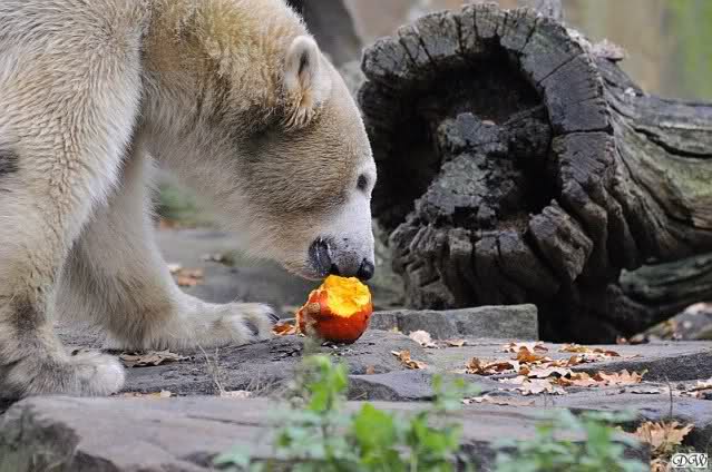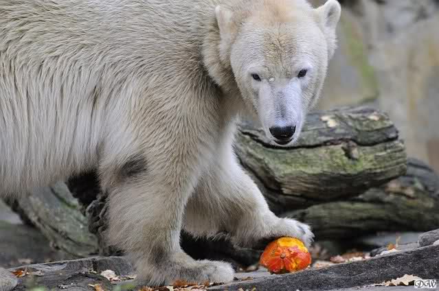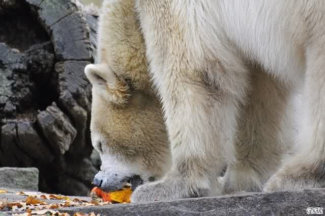 Die Fütterung wurde heute von der jungen Auszubildenden gemacht. Sie liebt es, Knut einzelne Weintrauben zuzuwerfen. Knut war wählerisch wie immer. Äpfel und Möhrchen wurden verpönt, wenn aufgefangen, gleich wieder fallengelassen. Fleisch und Fisch wurden unverzüglich verspeist. Heute kam die große Überraschung: Gianna kam mit ihrem eigenen Butterkürbis heraus während Knut mit seinem eigenen Kürbis beschäftigt war. Sie trug ihn zur Mitte der Anlage und inhalierte ihn praktisch. Knut fraß seinen langsam, war halb fertig damit als Gianna zu ihm nach unten schaute. Er rückte aus mit seinem halben Kürbis – und legte ihn wie üblich oben ab. Gianna steuerte direkt darauf zu und fraß auch ihn auf. Knut schaute zu.