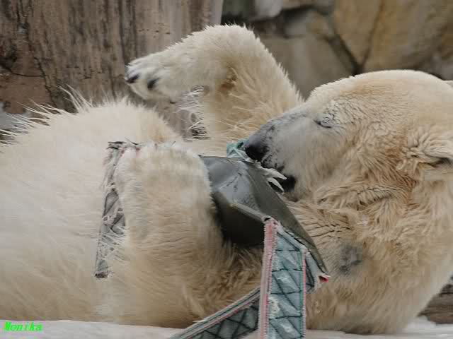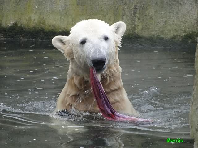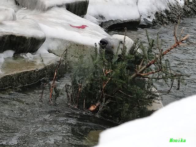 Heute morgen war bei Knut und Gianna Sonntagsruhe angesagt. Knut schlief, und Gianna lief und wollte immer wieder in die Höhle. Ab und zu ging sie nach Knut schauen und stubste ihn vorsichtig an. Knut zeigte die Tapirlippe und wollte seine Ruhe. So gegen 11.00 Uhr wurden beide munter. Heute war mehr spielen als schmusen angesagt. Knut holte alles aus dem Wasser, was er finden konnte. Von der Geburtstagskerze bis zum Tannenbaum.