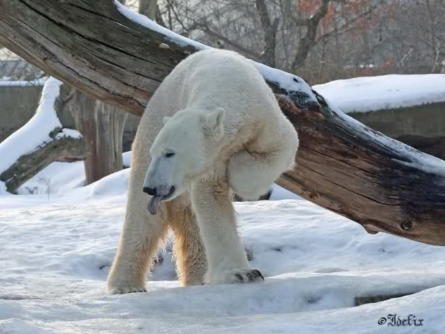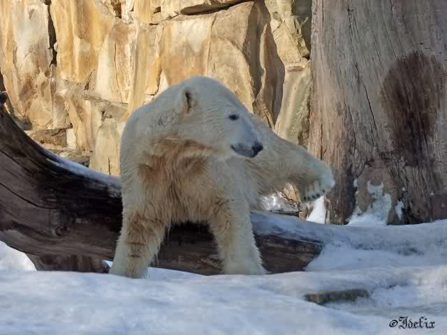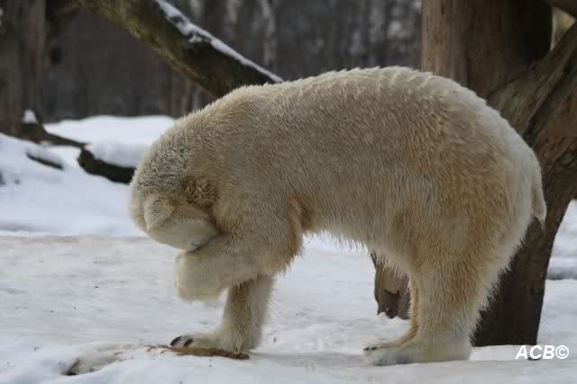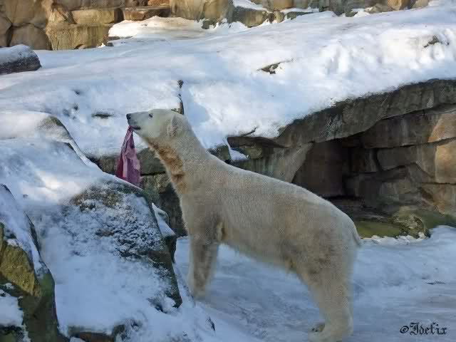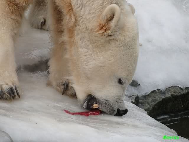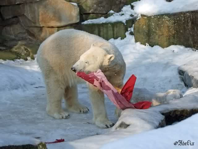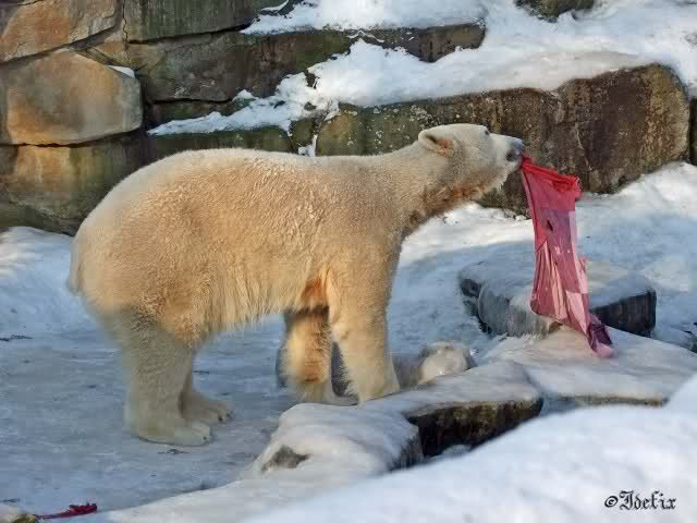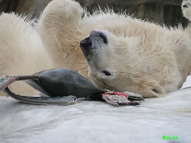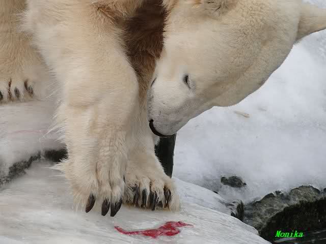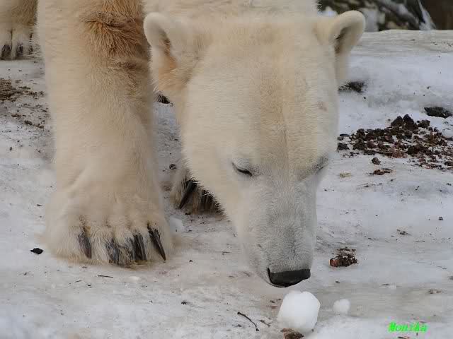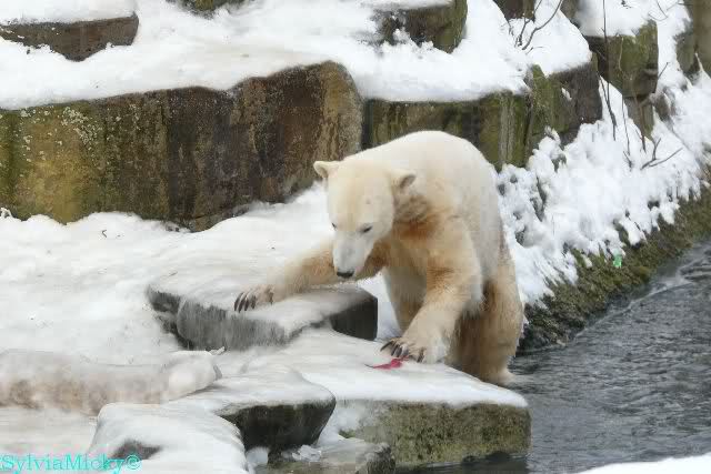 Knut hat sehr lange Krallen. Er schaffte es aber nicht den eingefrorenen Fetzen raus zu kratzen.