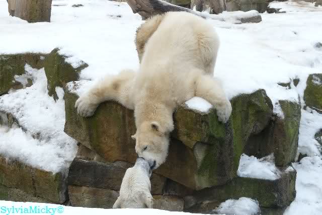 Endlich hat sich Knut‘ s Mühen gelohnt. Sie rutschte runter es gab Nasenkontakt