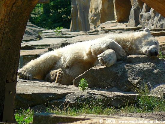 Das machte aber unserem Eisbären scheinbar nicht viel aus, denn er war heute sehr in Aktion und tummelte sich stundenlang im Wasser herum. Irgendwann am frühen Abend schlief er dann eine Runde, sprang aber dann wieder zur Freude der Besucher ins Wasser und hatte seinen Spaß.