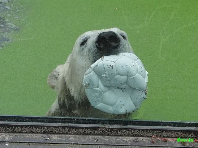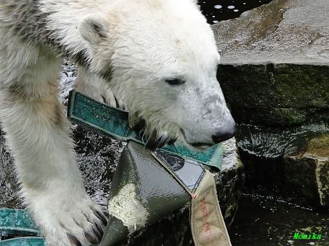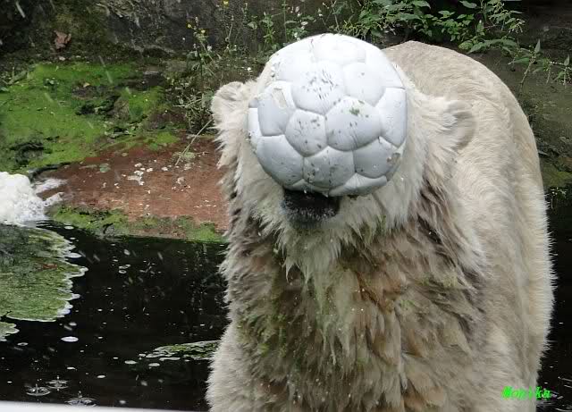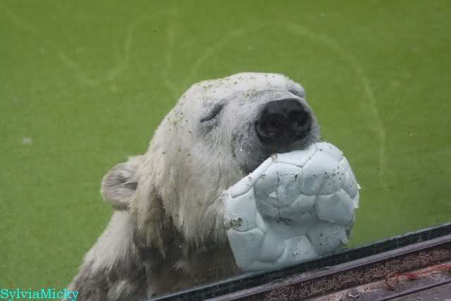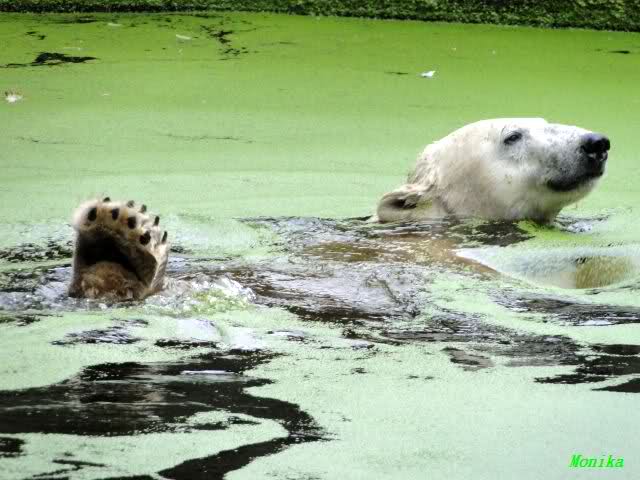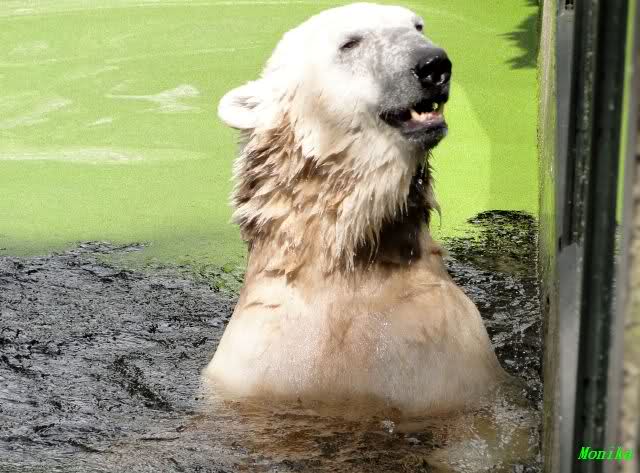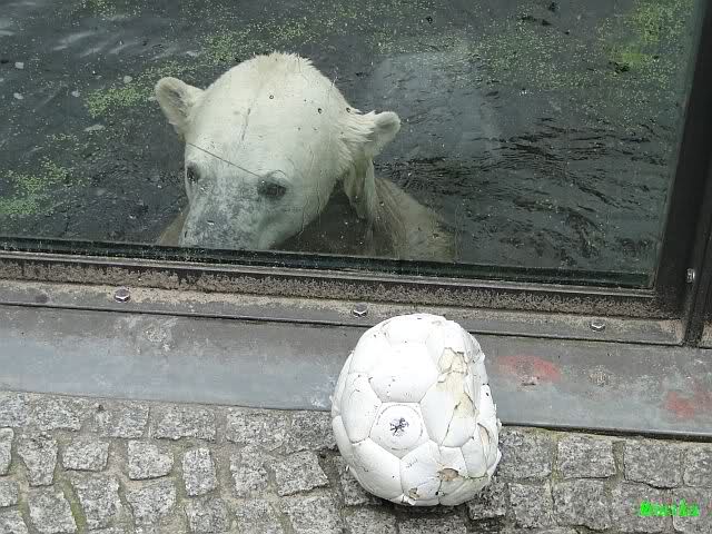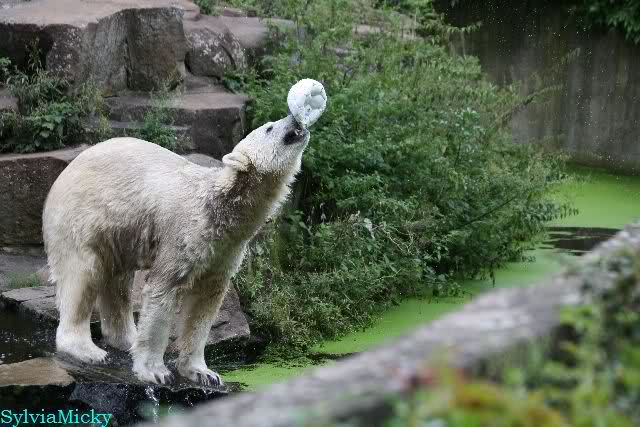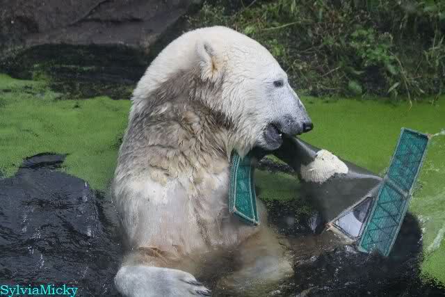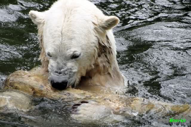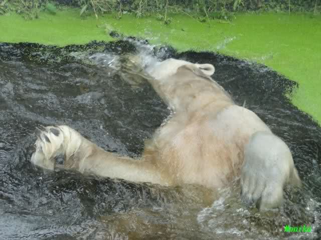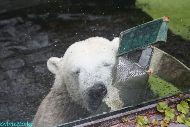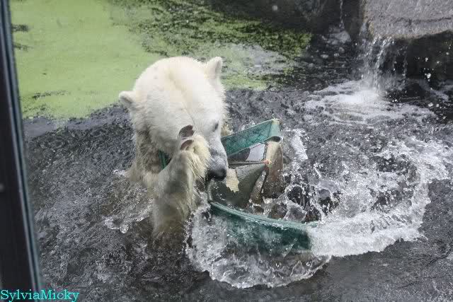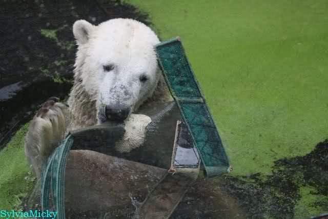 Als ich am Vormittag in den Zoo ging, war Knut schon im Wasser und tobte mit dem Baumstamm, Ball, Rest Ochsenschwanz und Huhn. Als ich gegen Mittag den Zoo verließ war Knut immer noch im Wasser.