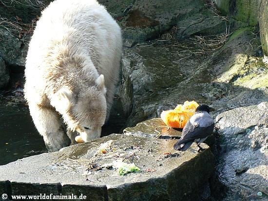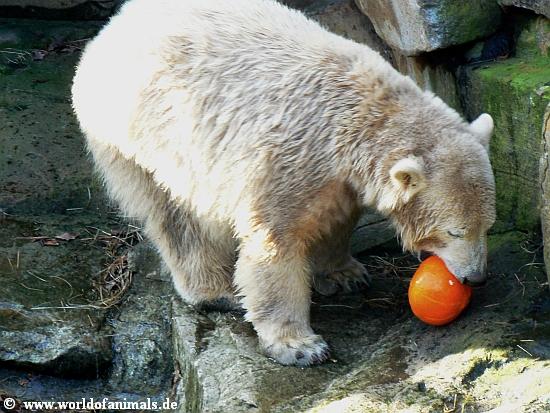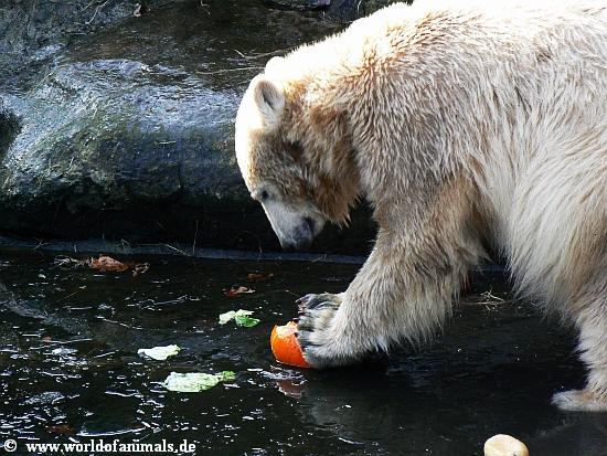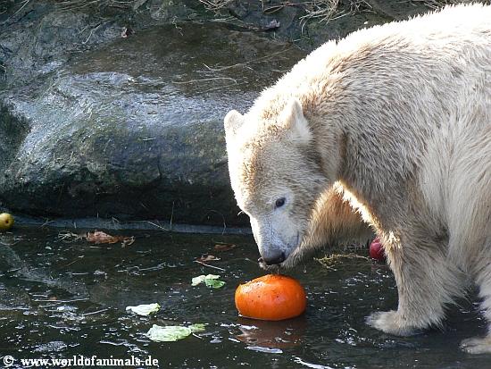 here are my nect pictures from Knut at sunday afternoon. He did play in water. But before that, he got his food: Fish, apple, croissants, pear, wine grapes, and a little pumpkin....