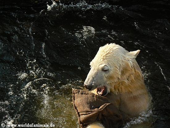 Knut im Wasser, aber vorher bekam er ja sein Futter. Das war gestern reichlich: Fisch, Weintrauben, Birne, Apfel, Brötchen, zwei Croissants und einen kleinen Kürbis. Den zerlegte Knut mit Leichtigkeit. Besonderen Spaß machte es ihn, Rest des Kürbis durch die Luft zu werfen. So, wie es Eisbären in der freien Natur manchmal mit ihrem erlegten Futter tun.