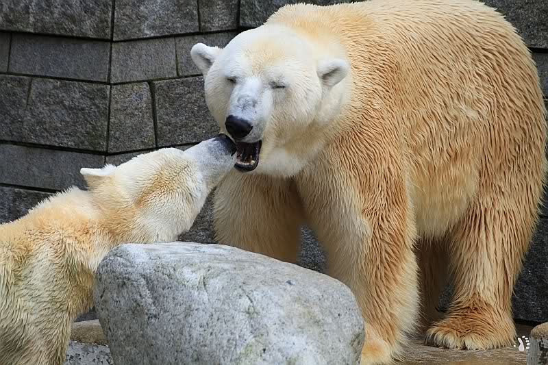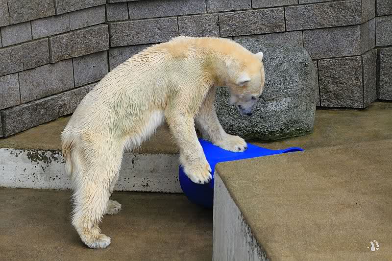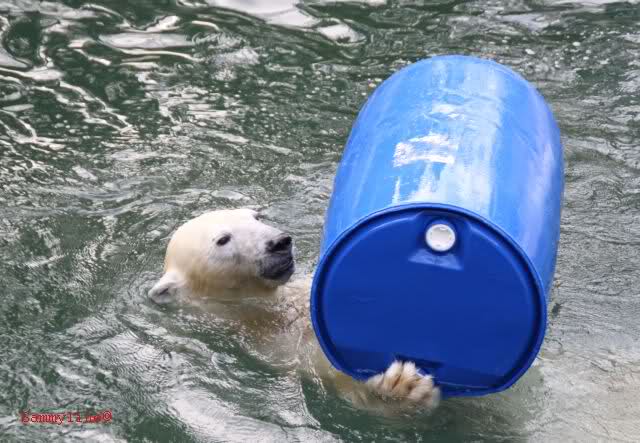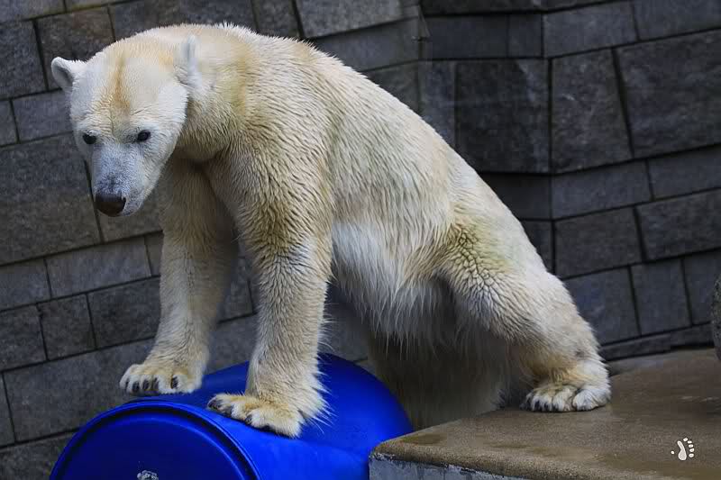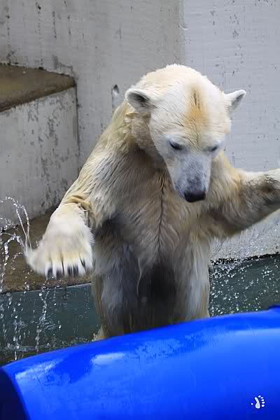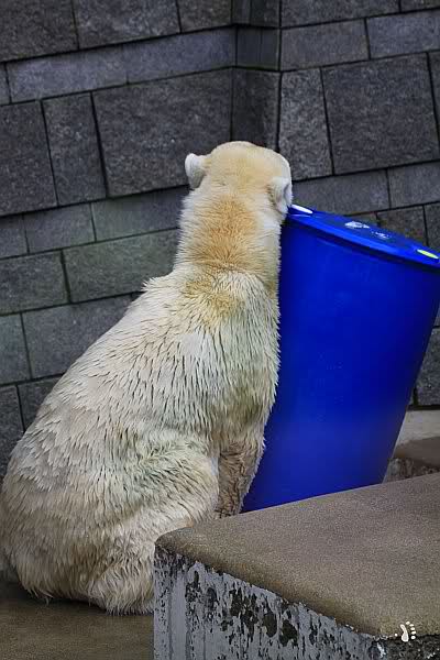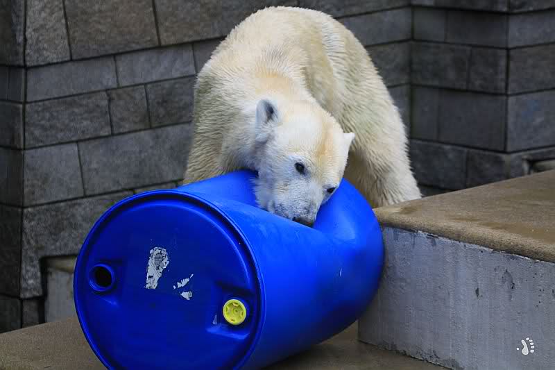 Lars ist ein erfahrener Eisbärmann und weiß, dass er keine Chance hat an die Tonne zu kommen, solange Vilma diese bearbeitet.