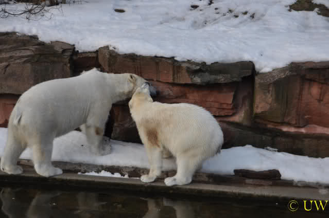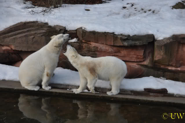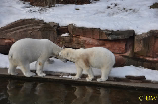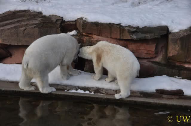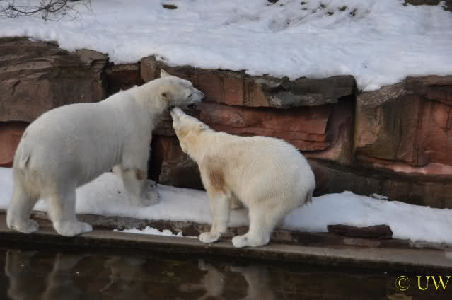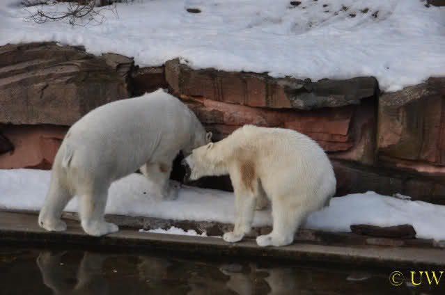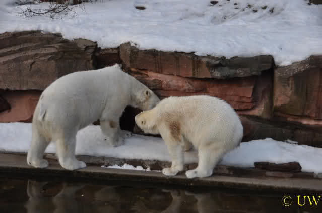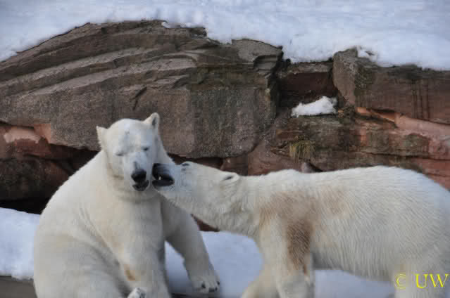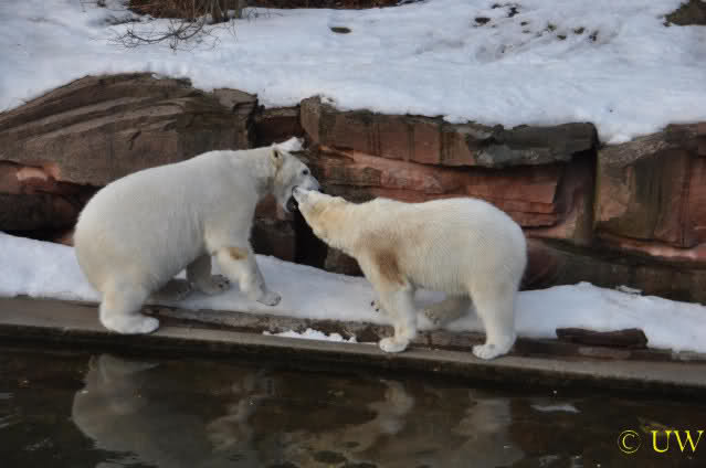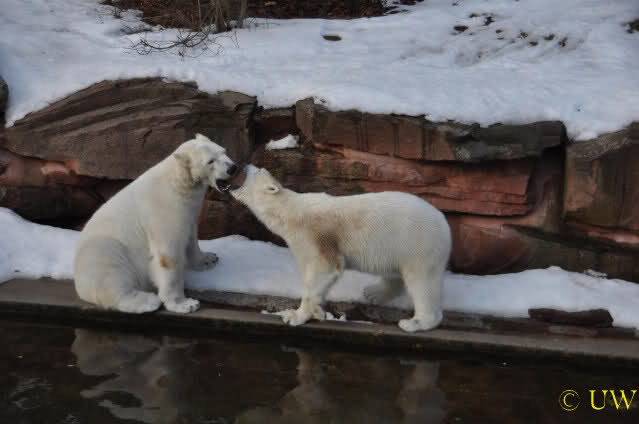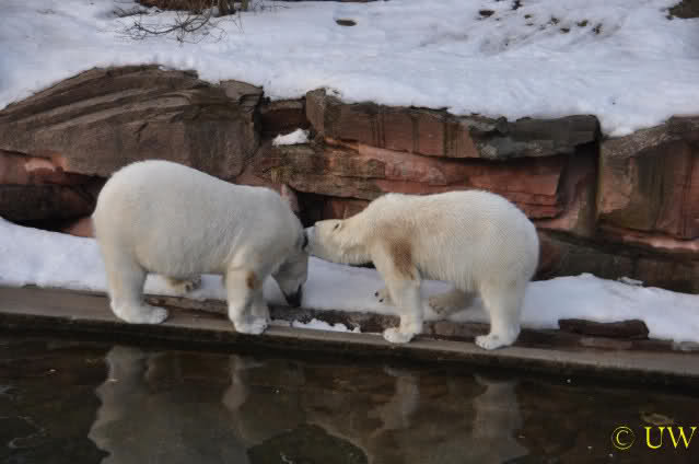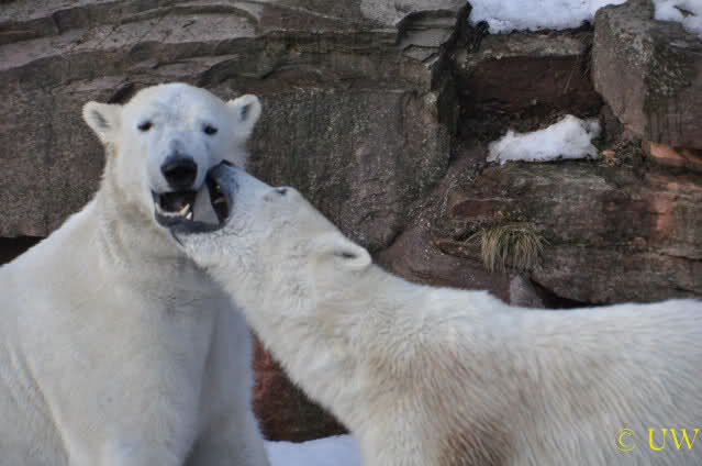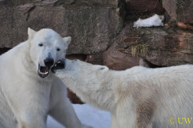 Die beiden passen sehr gut zusammen und bei Eisbären geht es schon etwas derber zu, insofern kannst Du sogar Recht haben, dass Flocke schmusen will. Hin und wieder langt sie da aber auch kräftig hin bzw. beisst ganz kräftig - aber Eisbären halten das aus.