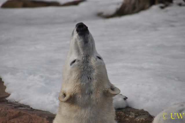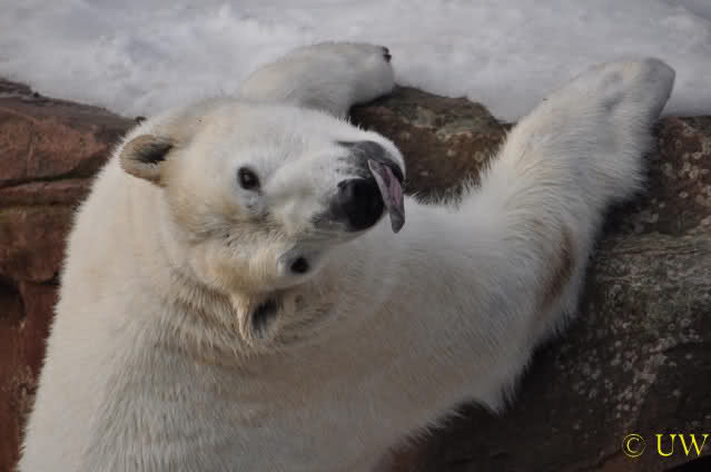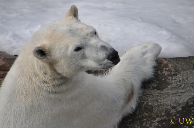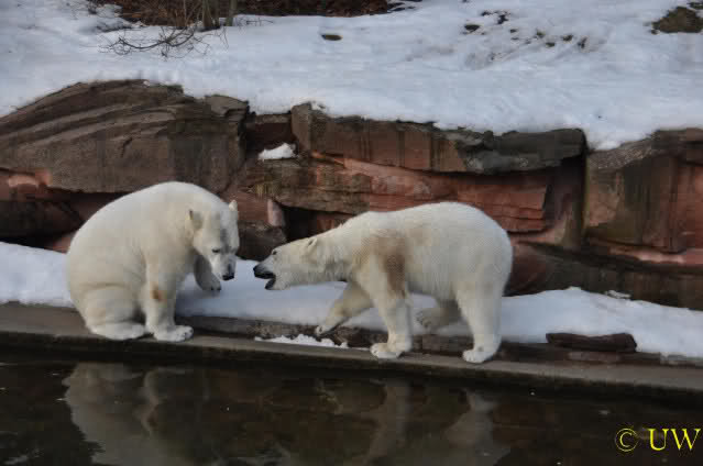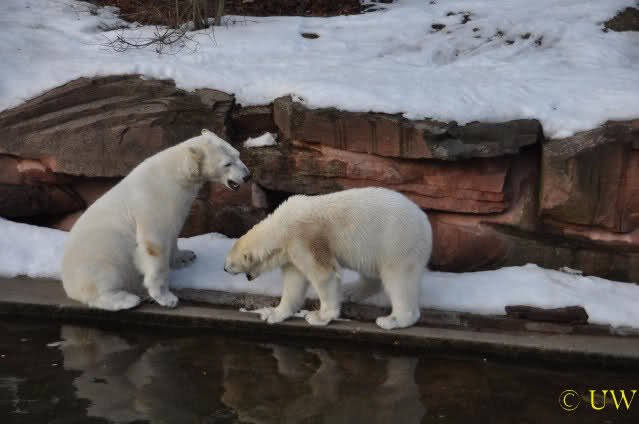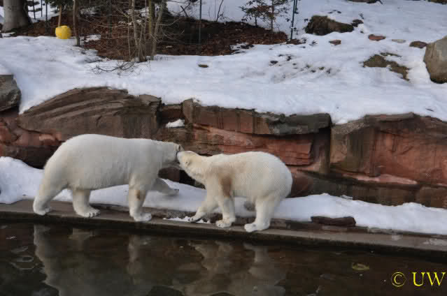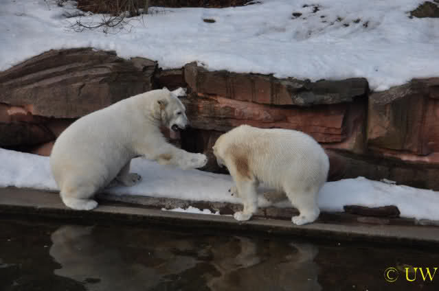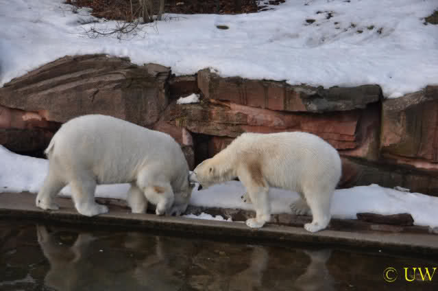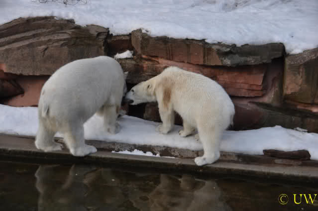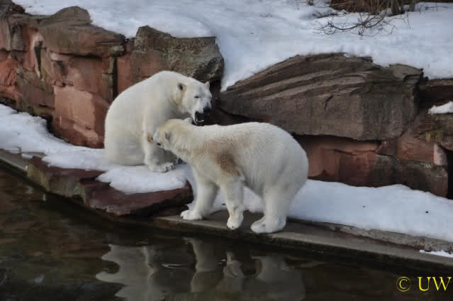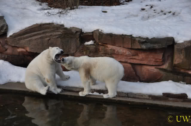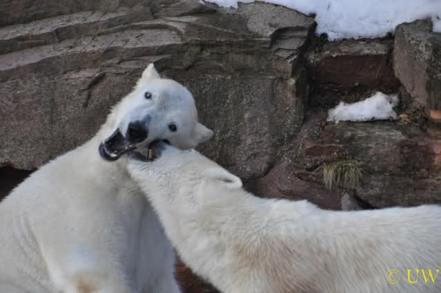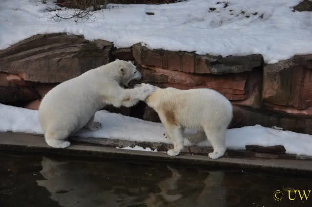 Die beiden passen sehr gut zusammen und bei Eisbären geht es schon etwas derber zu, insofern kannst Du sogar Recht haben, dass Flocke schmusen will. Hin und wieder langt sie da aber auch kräftig hin bzw. beisst ganz kräftig - aber Eisbären halten das aus.