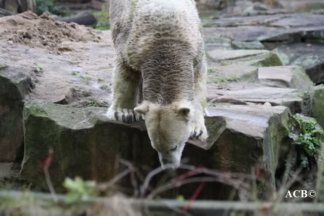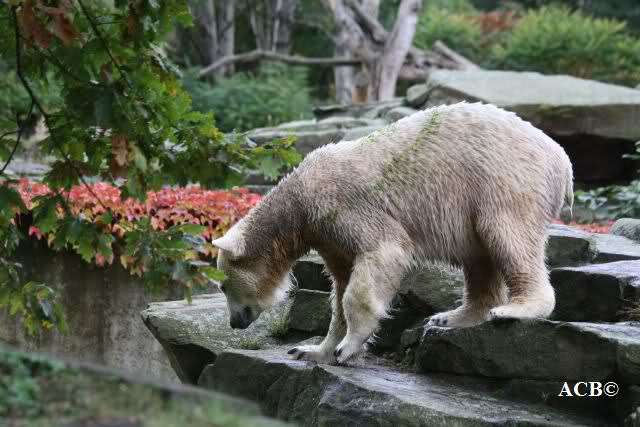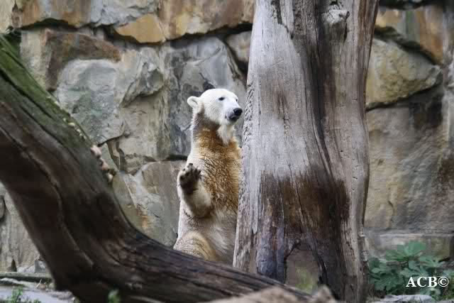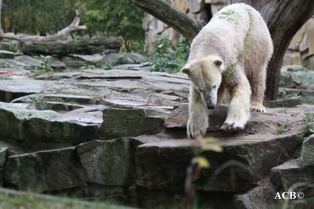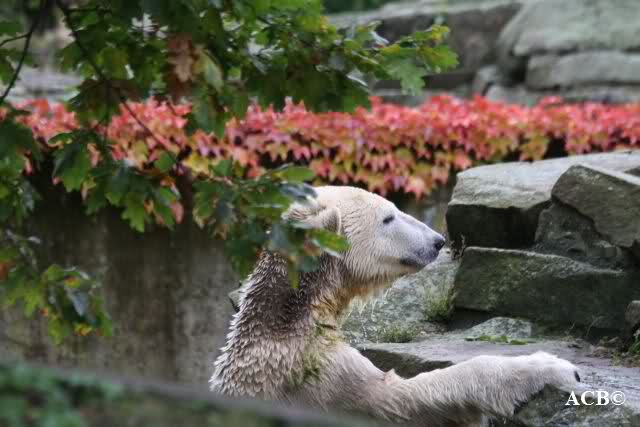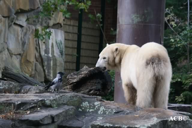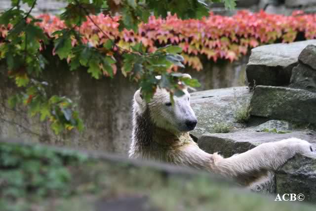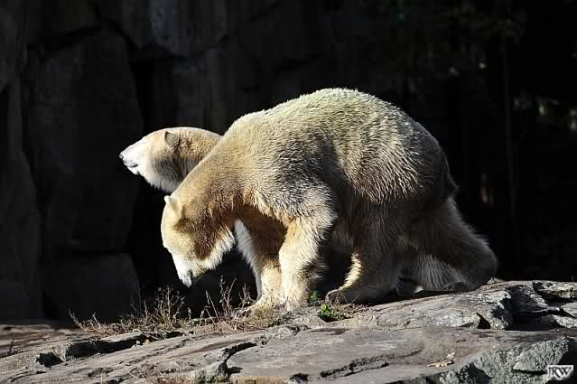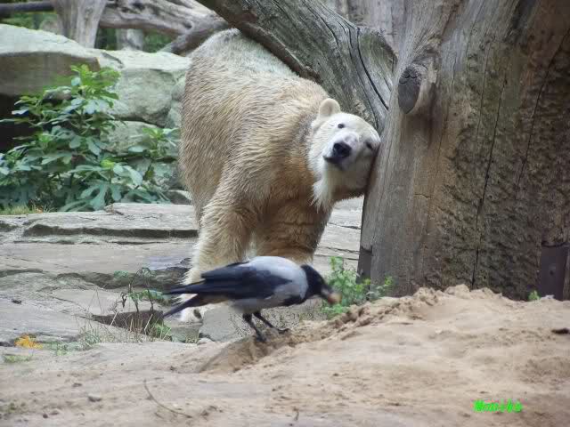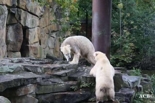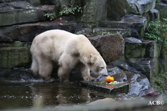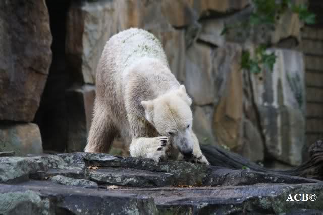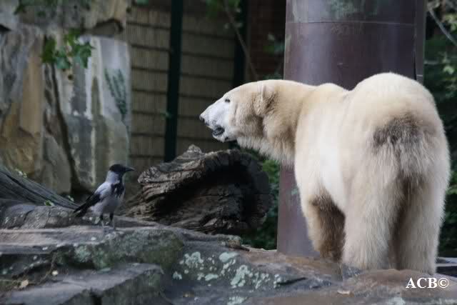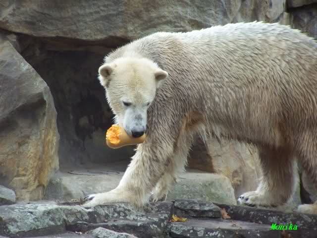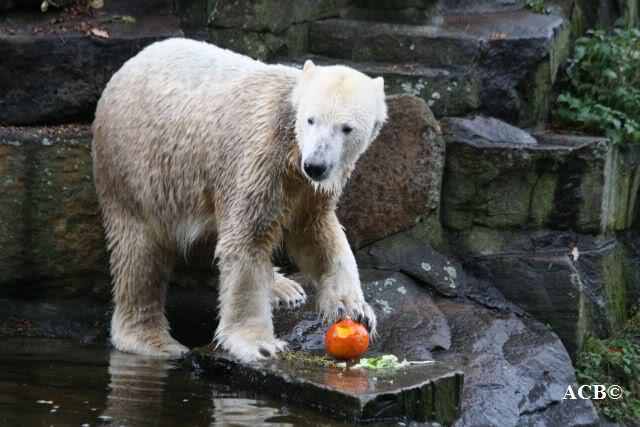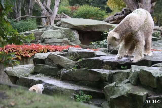 Meine "Hexe" ist zwar noch nicht so ganz verschwunden, aber es zog mich heute trotzdem in den Zoo. Mit etwas "Schmerz-Doping" ging es dann auch einigermaßen. Heute Vormittag war es sehr ruhig bei unseren Bärenkids. Beide dösten vor sich hin. Knut schien mir heute doch etwas nervös, lag oft mit angelegten Ohren da. Und dann wieder der Baulärm vom Bärenhof! Knut bekam heute wieder einen Kürbis zum Lunch. Er hatte ihn gerade zwischen den Zähnen, als Gianna rauskam. Sie schnappte sich erstmal einen Apfel, den sie oben im kleinen Pool fand, und verfolgte anschließend Knut mit seinem Kürbis. Er ließ ihn dann irgendwann wieder fallen, und Gianna fraß ein wenig davon. Das Spielchen dauerte ein paar Minuten. Der Kürbis, oder besser gesagt, die Reste davon, gingen zwischen beiden immer hin und her. War niedlich anzusehen.