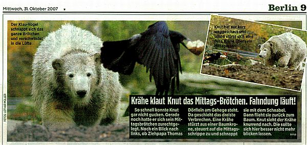 Danke, lieber Hartmuth, dass Du den Beitrag über die freche Krähe in Knuts Gehege eingestellt hast. Ich habe das Bild schon heute Mittag gesehen und mich darüber amüsiert.