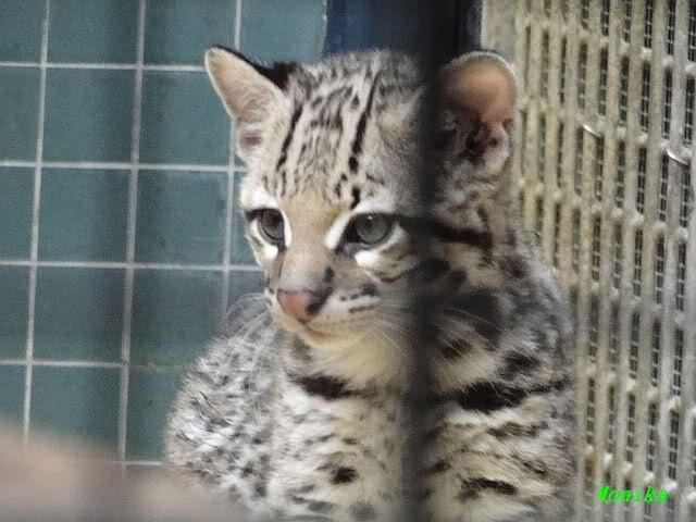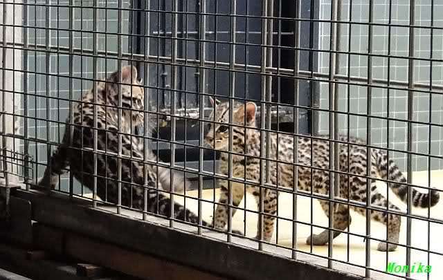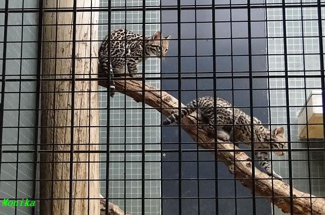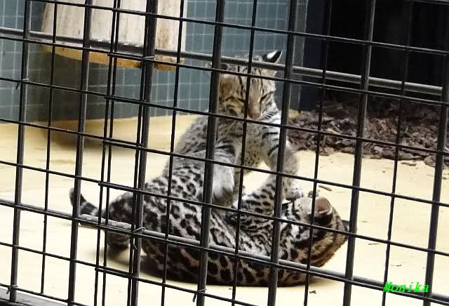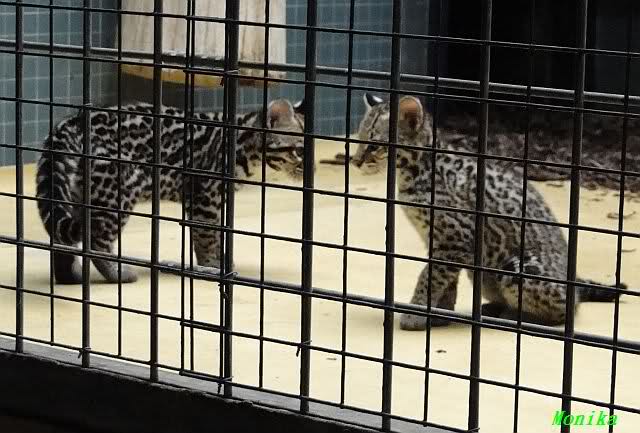 Die Ozelot-Kinder sind schon schön gewachsen und toben ausgelassen in ihrem Käfig.