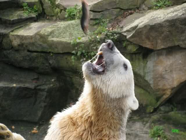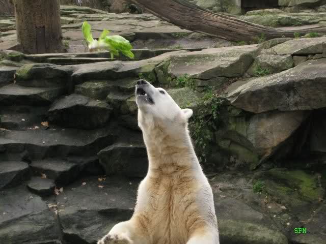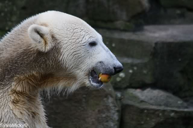 Knut bekam heute sehr viel Futter, 5 Stück Fleisch, einige Fische, Brötchen, Obst und Gemüse.