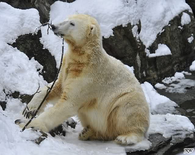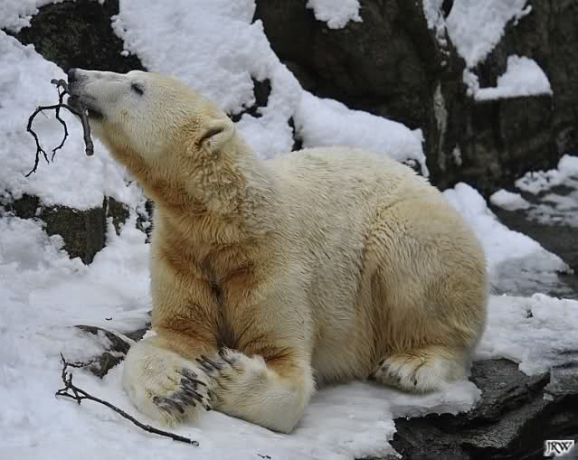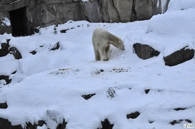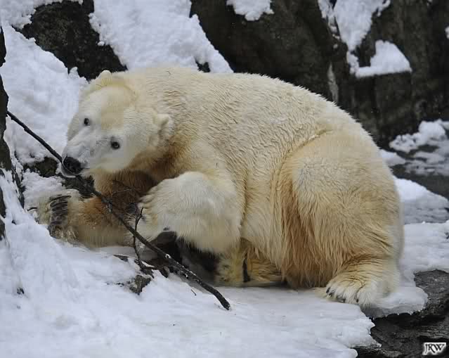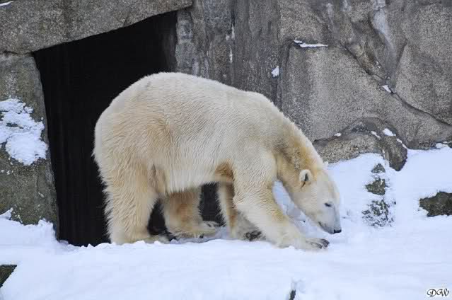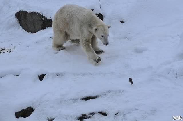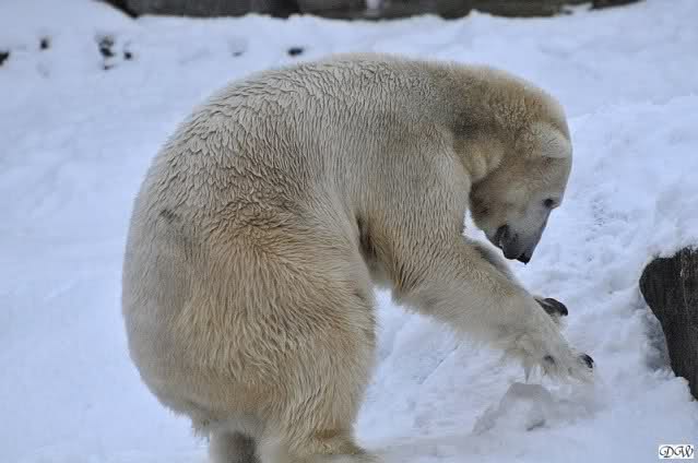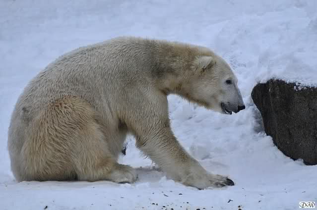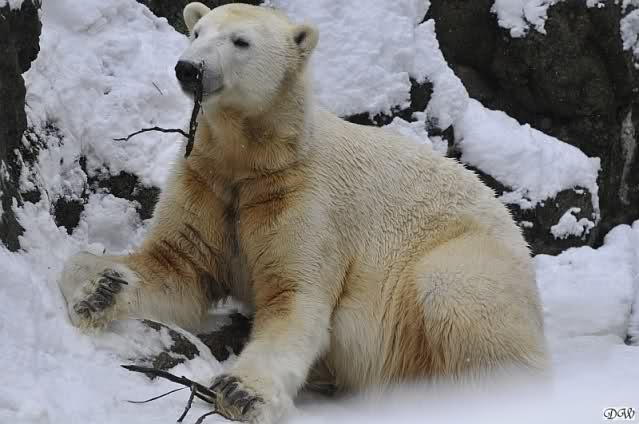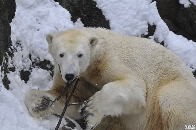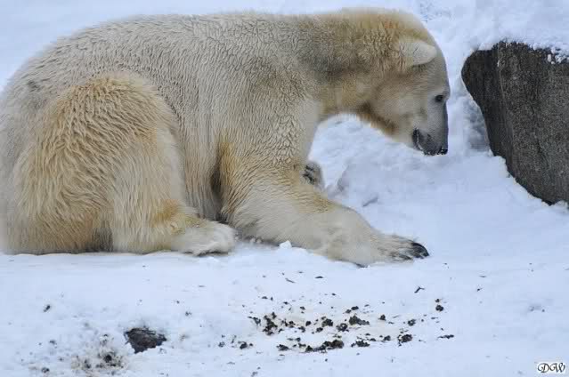 Nancy schlief in Kati's Höhle, Tosca lief langsam herum, Kati jedoch kam immer wieder um zu sehen was Knut macht. Immer wenn er sich hochstellte um zu sehen was auf dem Felsen los war, schaute er in ihr Gesicht. Auch Knut war etwas bequem heute. Schneebälle, die ihm zugeworfen wurden, holte er nur, wenn er sie sitzend oder liegend erreichen konnte. Konnte er es nicht, schaute er wieder hoch und wartete auf den nächsten. Bekam er den Schneeball, spielte er damit und verspeiste ihn dann.