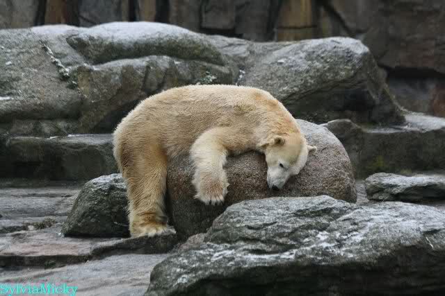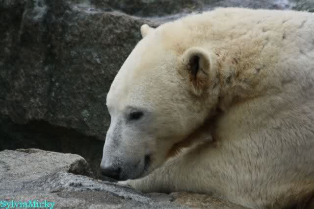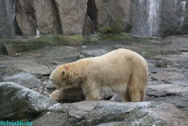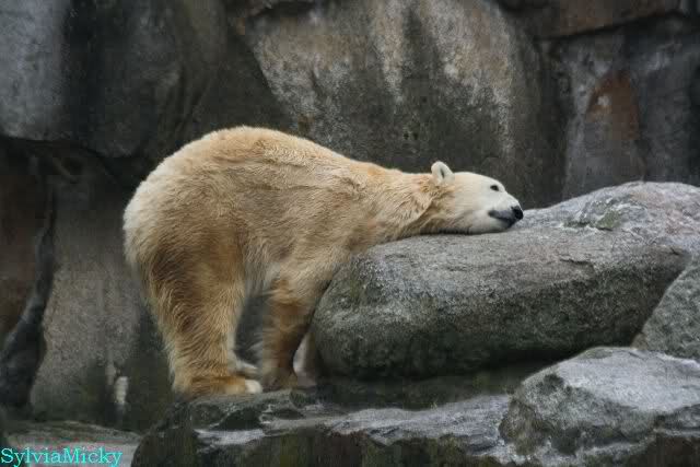 Auch heute war Ruhe am Vormittag angesagt. Knut wurde wieder auf dem Plateau gefüttert. Als die Bären gefüttert wurden, schubberte sich Nancy noch an dem Felsen.