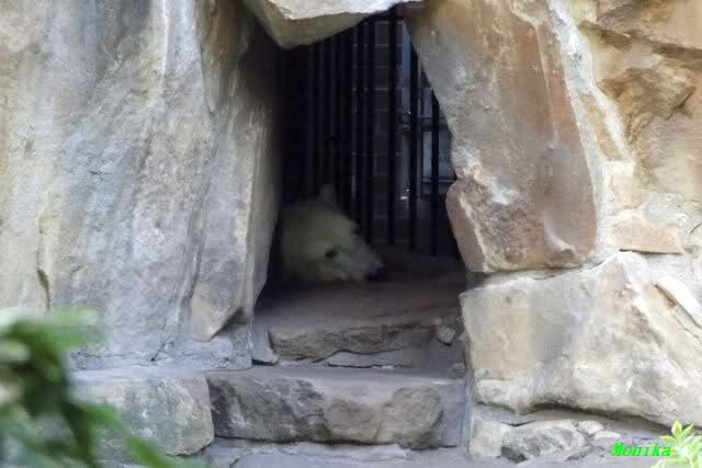 Ich bin heute Abend kurz auf eine Stippvisite in den Zoo, weil ich sehen wollte, ob Knut noch auf seiner alten Anlage ist. Er war da und wartete auf sein Abendessen. Danach ließ er sich draußen nicht mehr blicken. Er friemelte in der Höhle und schaute ab und zu mal heraus.