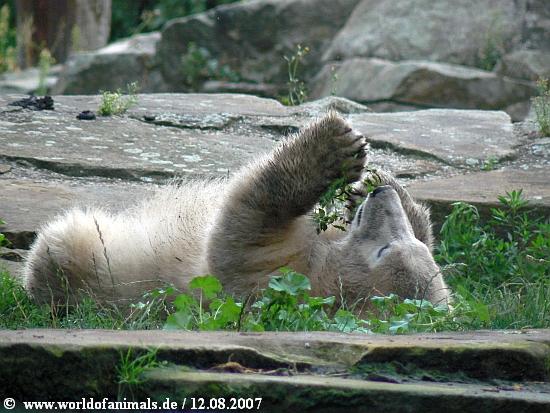 Es ist ja gut bekannt, dass die Eisbaeren Einzelgaenger in ihrer Rasse sind, und ja, okay, wenn Knut in dem richtigen Alter ist. Aber mit 8 Monaten ist er zu jung ein "Einzelgaenger" zu sein und auch nicht richtig spielen zu koennen! Wenn sie Angst haben, dass er etwas verschluckt, dann muss es eben etwas sein, das nicht so leicht kaputt geht. Kleine Tiere auch wie Menschen muessen spielen um sich zu entwickeln!