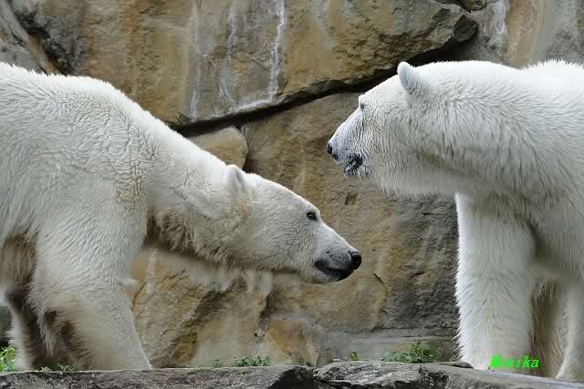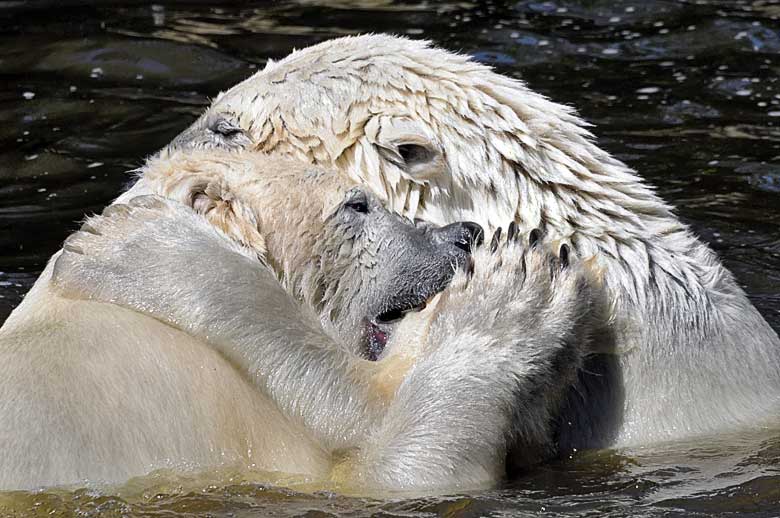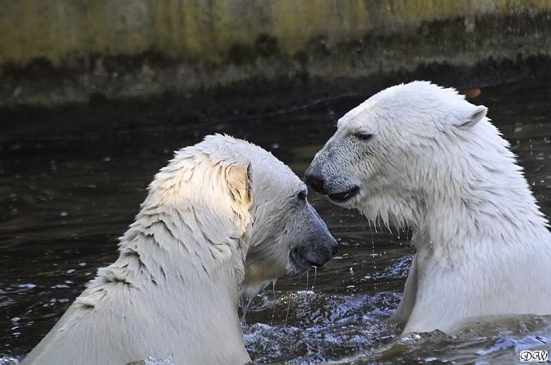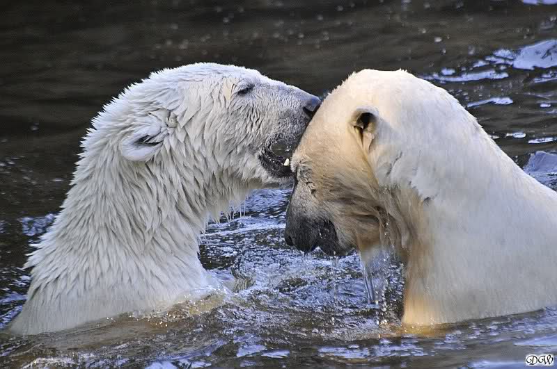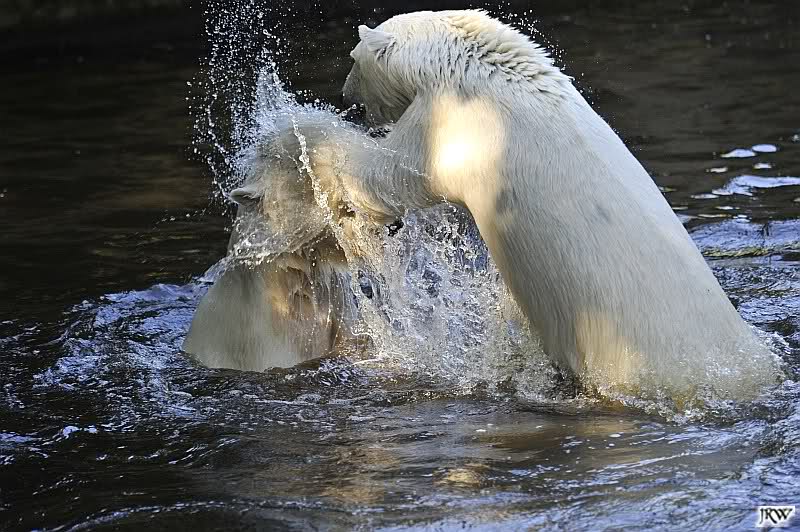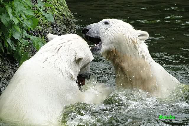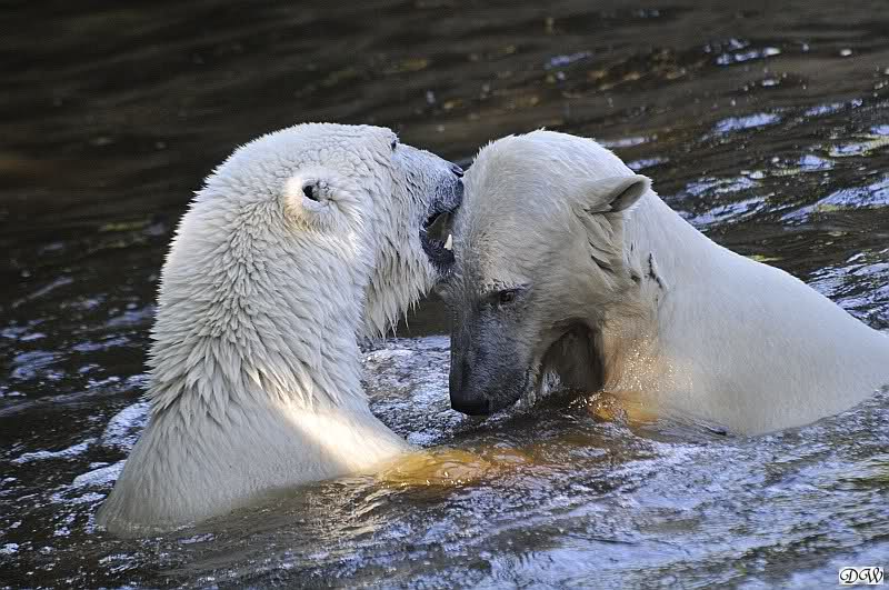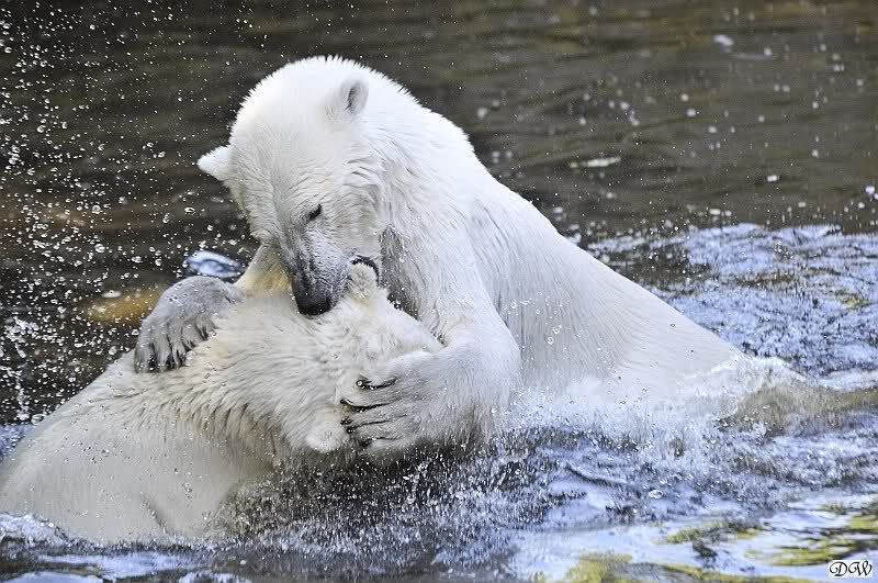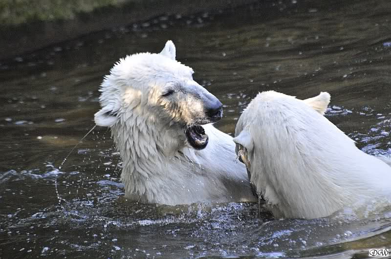 Danke, Frans, für die Wahnsinnsaufnahmen. Der Blick in das Maul eines Eisbären flößt schon Ehrfurcht ein. Um so erstaunlicher ist es, das sich Giovanna und Knut gegenseitig nicht weh tun, obwohl sie sich immer im Nacken das Anderen *festbeißen*. Aber es ist alles Spiel und Training fürs Leben.