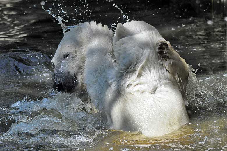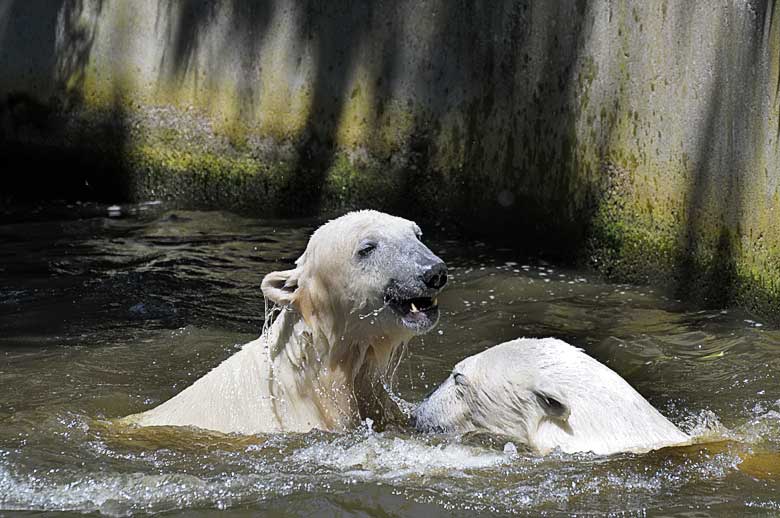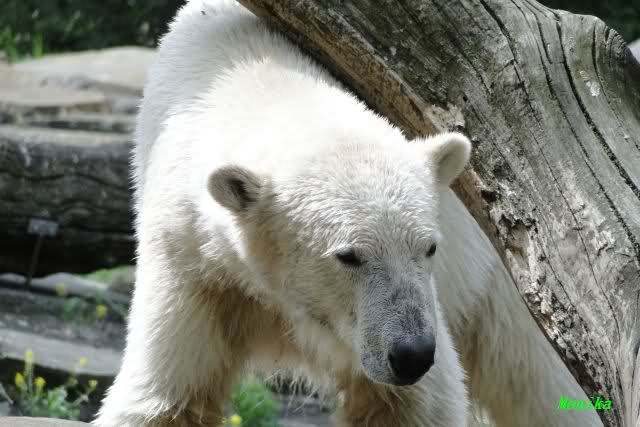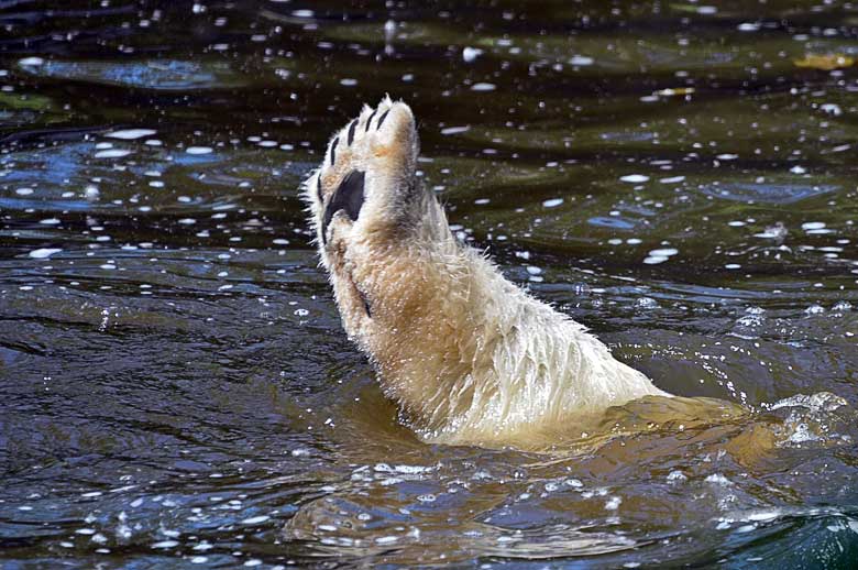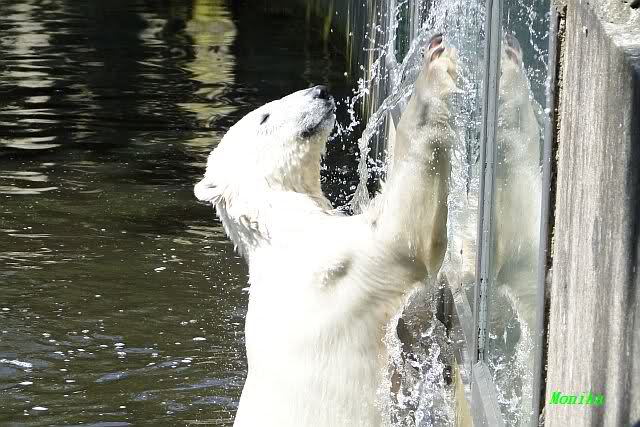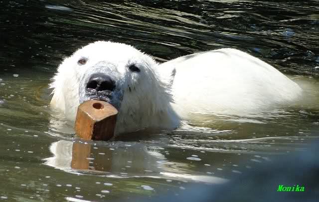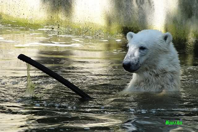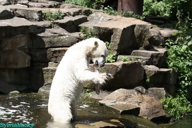 Nach der Fütterung lief Gianna wieder hin und her über die Anlage und Knut war im Wasser und pfriemelte mit einer Holzscheibe und einem Zweiglein rum.