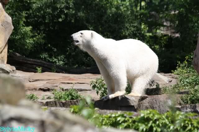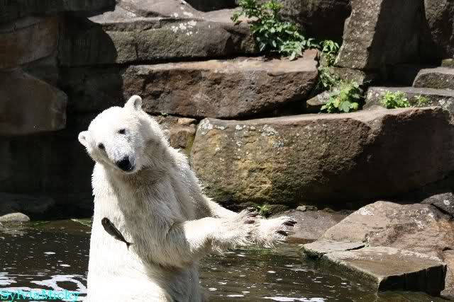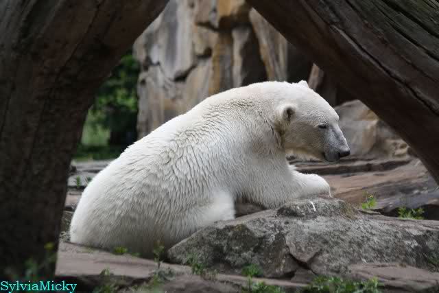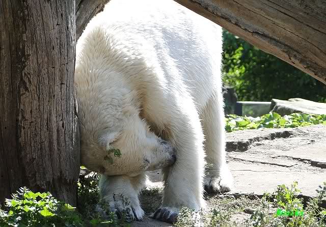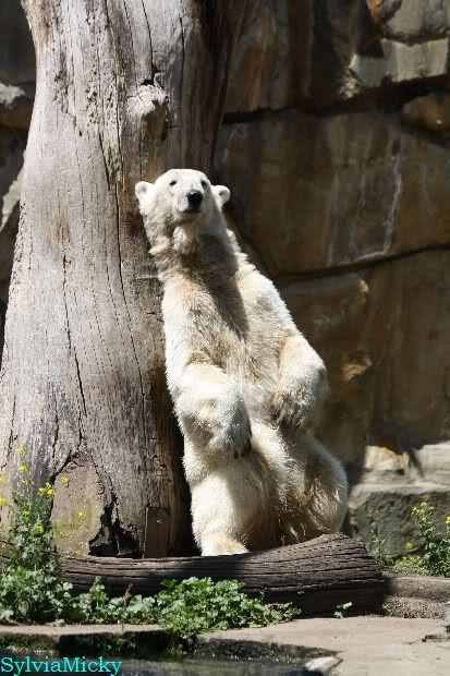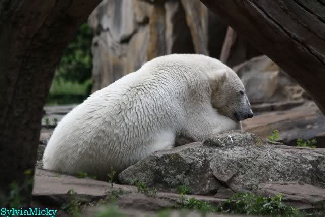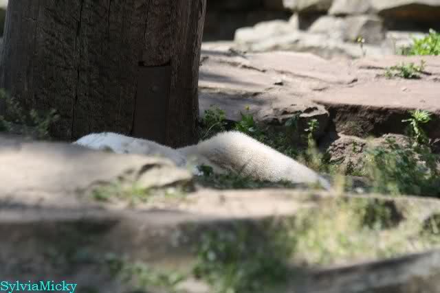 Einige Zeit vor der Fütterung erwachte Knut, streckte, reckte sich mit Katzenbuckeln und schlurfte hektisch zur rechten Seite. Da wurde dann wieder gedöst, zwischendurch gereckt, gestreckt und Katzenbuckel gemacht.