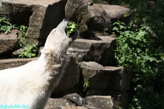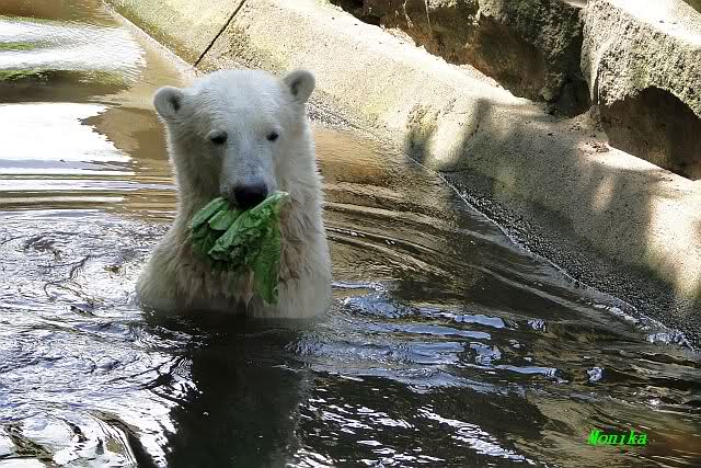 Der ungeliebte Salat. Knut nahm ihn mit ins Wasser, schwamm um die rechte Ecke. Nach der Fütterung ging Gianna auch ins Wasser, dann hörte man Knut laut brummen und Gianna kam kauend wieder hoch