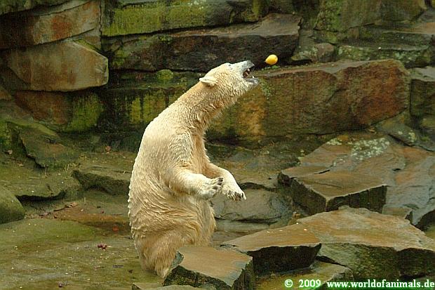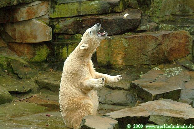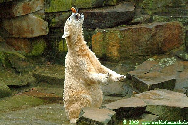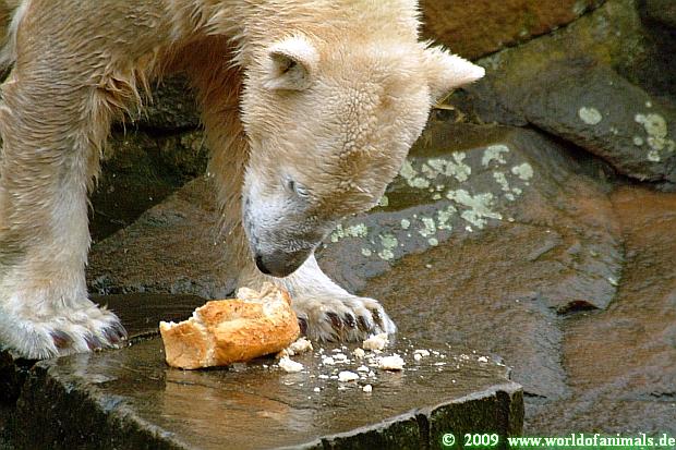 Ich habe nun noch Fotos von gestern, von Knuts Fütterung durch Frau Weckert. Es macht Spaß ihr zuzusehen wie sie mit dem Bären *spielt*. Alles läuft in Ruhe ab und sie lässt sich die Zeit. Sie zeigt dem Bären, was er als nächstes bekommt, lässt ihn in Ruhe auffressen, bis er dann von selbst seine nächste Nahrung fordert. Wie ein eingespieltes Team schafft sie es immer öfter dem Bären seine Nahrung gezielt ins Maul zu werfen. Und der präsentiert sich als ein guter Fänger Sehr gut klappt es immer bei dem großen Weißbrot in Kastenform. Mir und vielen anderen Besuchern gefällt´s.