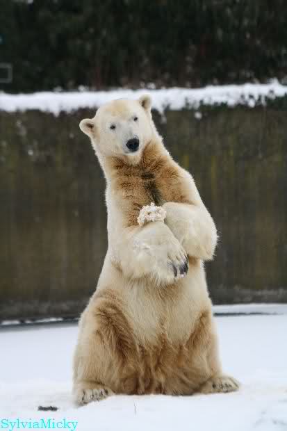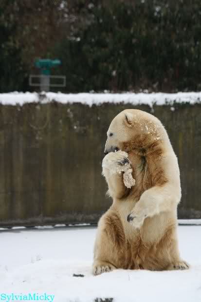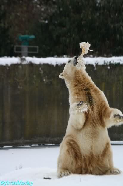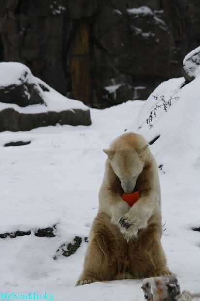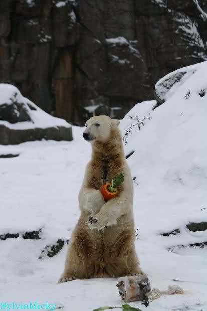 Danke Monika für deine Fotos, sie waren die ersten heute, die ich gesehn habe, ich liebe diese Kombination aus Knut, Schnee und Geburtatgskuchen...