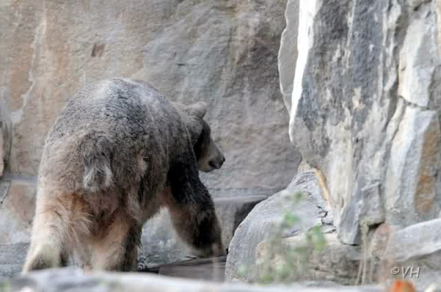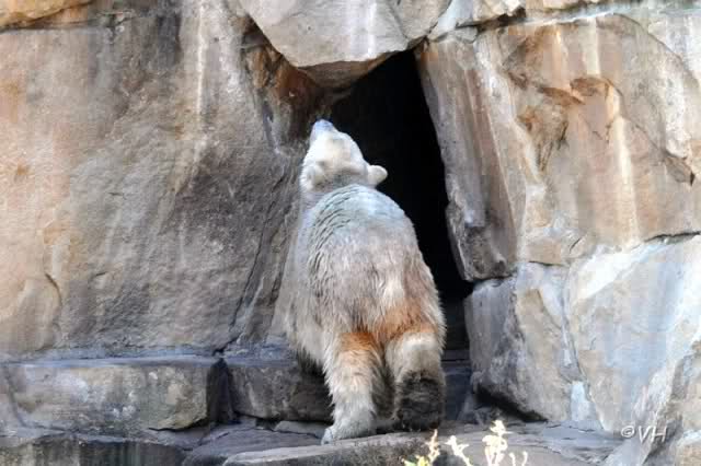 Dann ging es zu den Braunbären und dann zu Knut. Knuti wurde heute nach dem Prinzip gefüttert: „Das Beste zum Schluß“. Zuerst gab es Salat. Der wurde ignoriert. Dann Weintrauben. Die verschwanden im Wassergraben. Kartoffen und Brötchen folgten und sogar ein Schokocroissant. Das alles wurde gleich verspeist, so wie auch die Fische und das Fleisch. Als alles aufgegessen war, tauchte Knut und holte sich die Weintrauben aus dem Graben. Er machte damit nicht viel Federlesens. Dann suchte er den Graben ab, ob sich noch etwas Essbares darin findet. Als sich partout nichts mehr finden ließ, erbarmte sich Knut endlich über den verschmähten Salat. Wir sahen ihm noch lange zu. Knut machte noch allerlei nette Posen, verzichtete aber auf das niedliche Schubbern am Blechbaum.