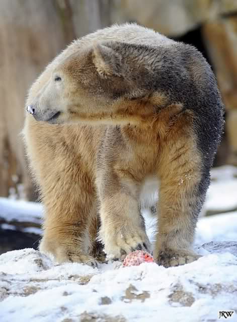 es war zwar ein sonniger, aber durch den Wind, eisiger Tag. Knut störte das nicht sonderlich. Er spielte sehr viel und hatte, wie seine Besucher auch, viel Freude heute. Mal war es das Nackthuhn, das Herr Röbke ihm aus seiner Höhle wieder auf die Anlage gelegt hatte, mal waren es die Pflanzkugeln.