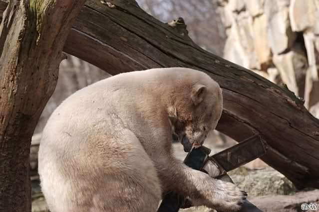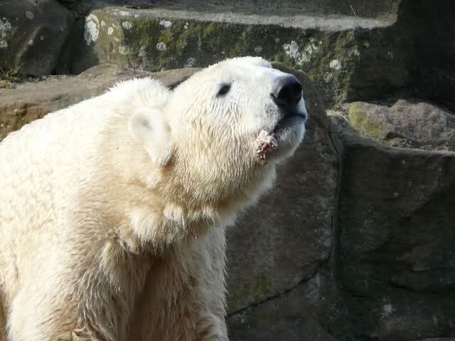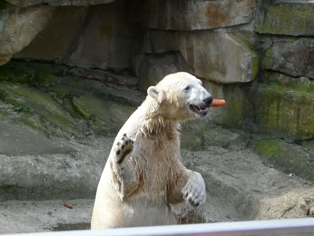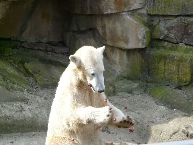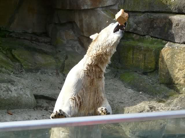 Heute war es im Zoo sehr, sehr voll. Knut spielte viel am Vormitag wie mir erzählt wurde. Zur Fütterung gab es zum Schluß wie gestern ein großes Stück Fleisch mit Knochen. Mit dem beschäftigte er sich den ganzen Nachmittag. Die Besucher standen bei der Fütterung in dreier Reihen am Gehege und auch wieder auf den Bänken.