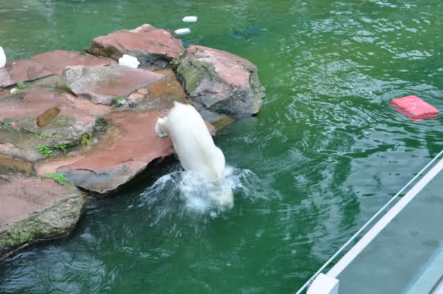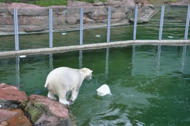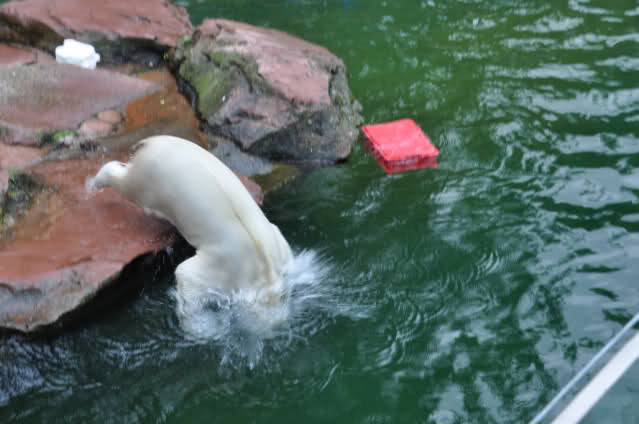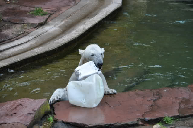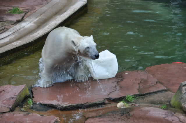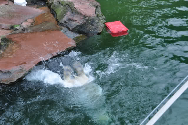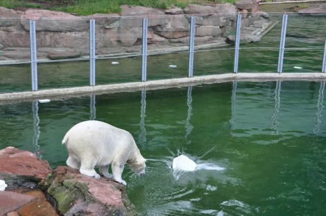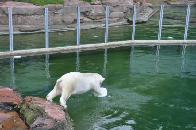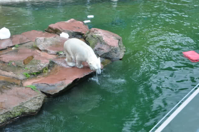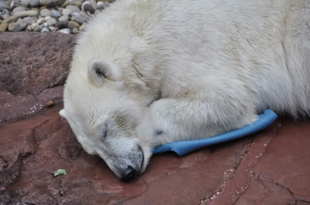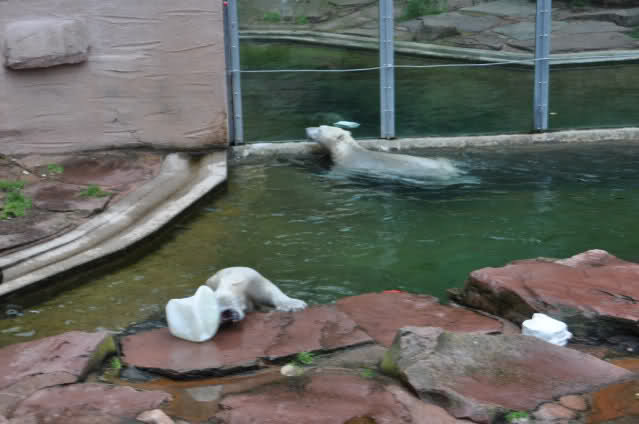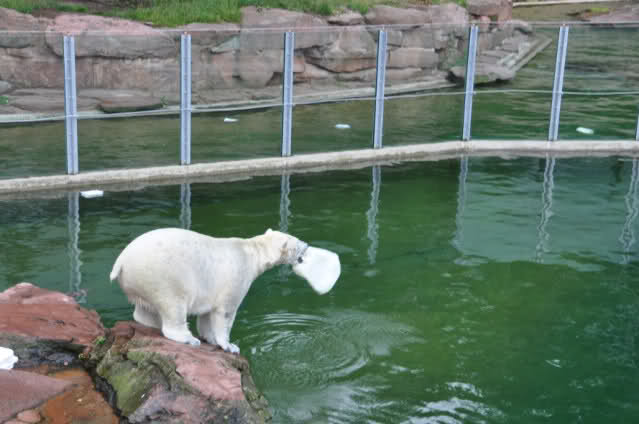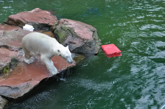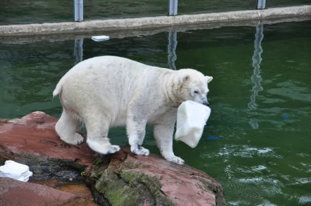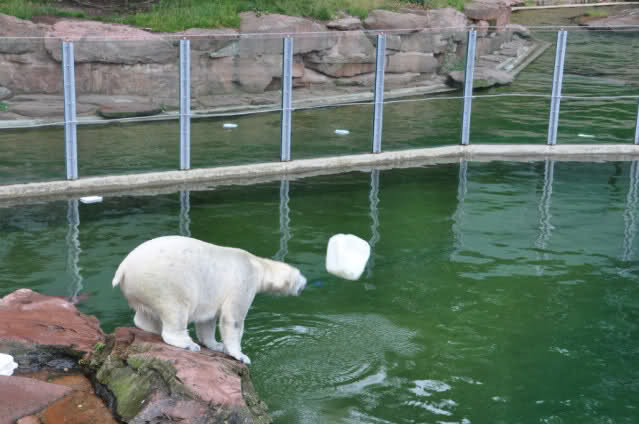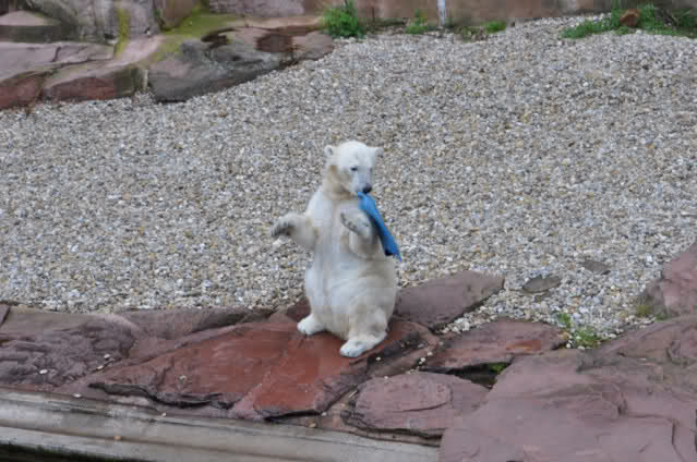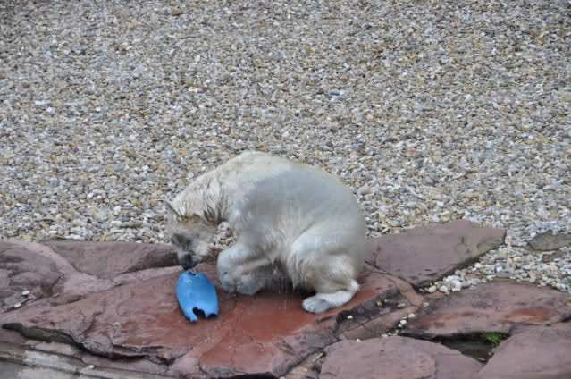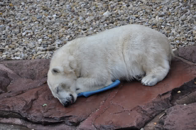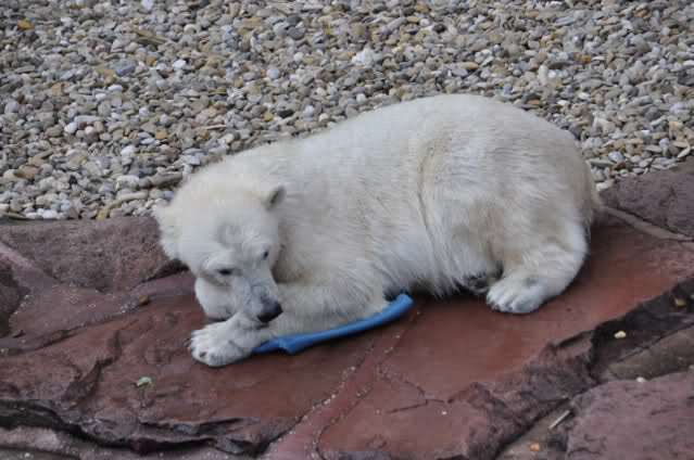 Flocke ist dann eingeschlafen und wir haben eine Runde durch den Tiergarten gedreht. Rechtzeitig zur Fütterung waren wir wieder da; Flocke hat die Fütterung kaum interessiert. Am Anfang hat sie ein paar Stücke Fleisch gefressen, aber nur, wenn sie sich dazu nicht allzusehr bewegen musste. Sie hat dann angefangen an ihrem Kanister zu nuckeln. Nur als ein paar Fleischstücke so geworfen wurden, dass sie getroffen oder fast getroffen wurde, hat sie sie dann gefressen. Rasputin hat das gar nichts ausgemacht, er hat ordentlich gefuttert, irgendwie muss man ja die Figur halten :-).