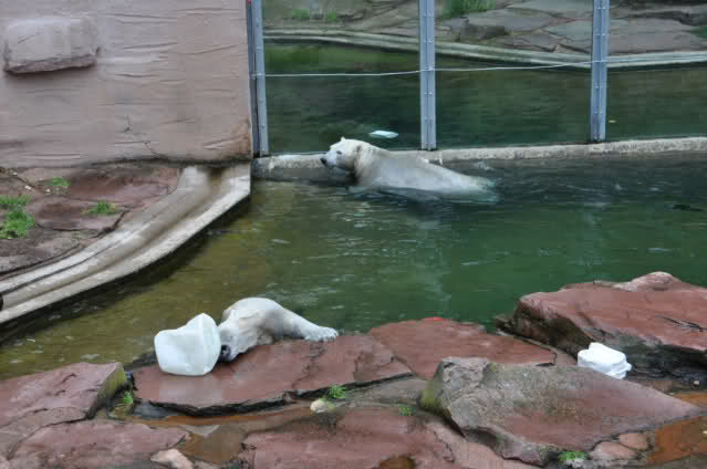 Ich bin der Meinung, dass man vorerst die Gehege vielleicht doch nicht zurücktauschen sollte, wie ja wohl angedacht. Die Bärchen haben trotz fehlender Grasfläche gute Gelegenheiten, sich zu amüsieren. Die Löcher in der Wand, die man vollstopfen kann, um das Zeug dann mühsam wieder rauszupfriemeln und nicht zuletzt die Möglichkeit, den Besuchern ganz nah zu kommen. Raspi hat gestern auch Leute erschreckt, das habe ich aber nur akustisch mitbekommen, wenn es mal wieder heftig gerumst hat und Kinder anfingen zu kreischen. Da hatten beide Seiten jede Menge Spaß. Und Vera fühlt sich glaube ich allein im großen Gehege ziemlich wohl. Auf jeden Fall wirkt sie sehr entspannt.