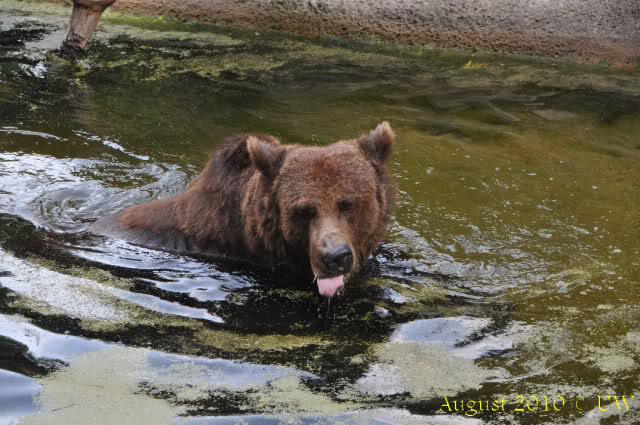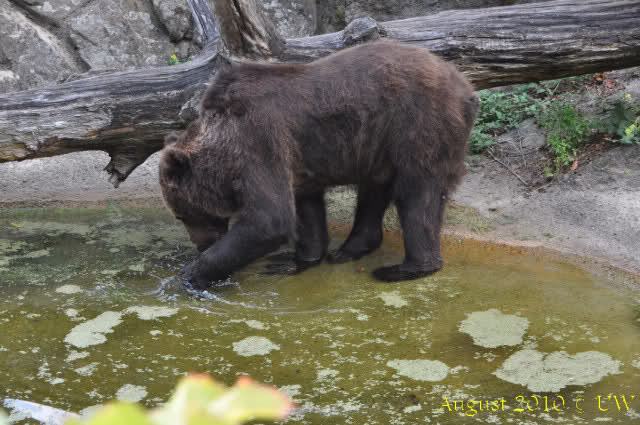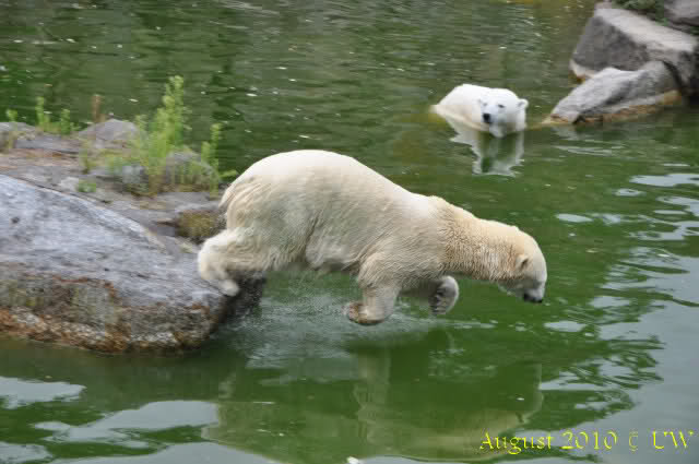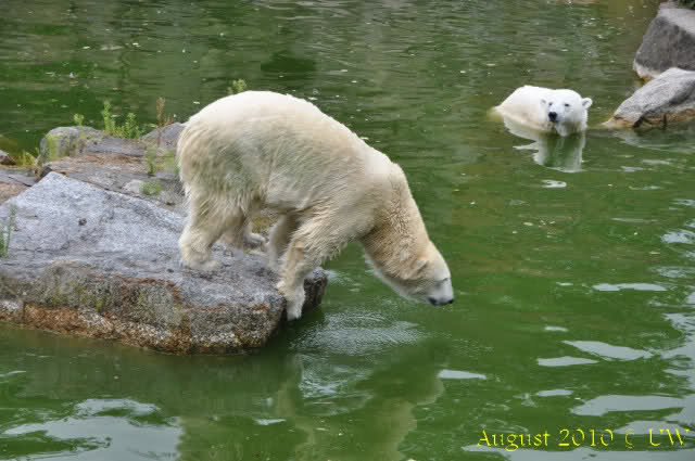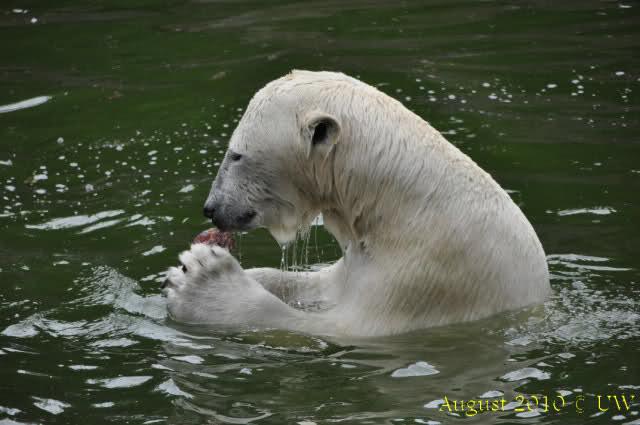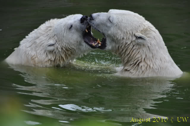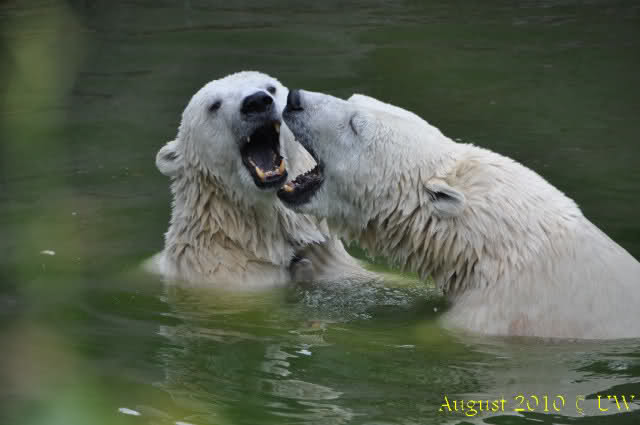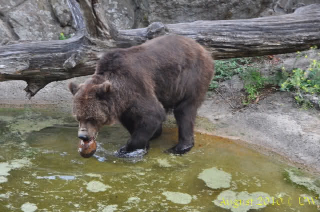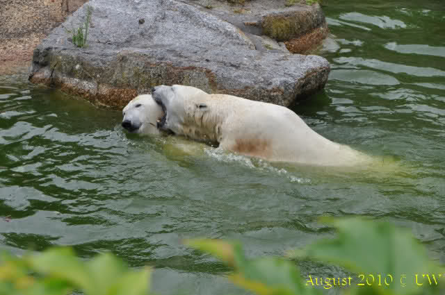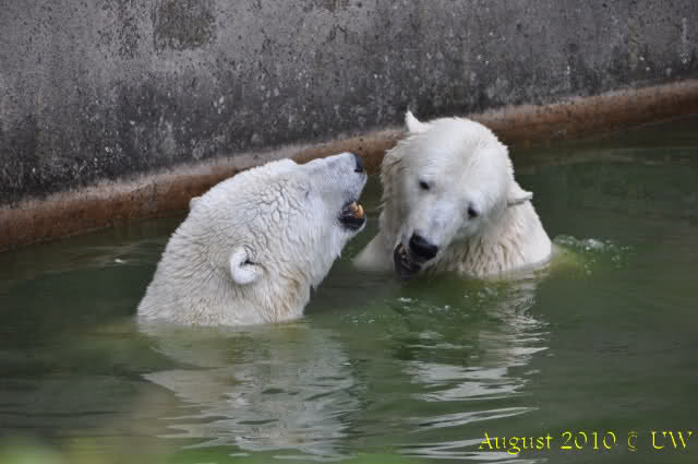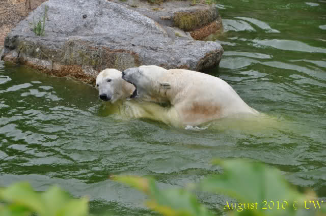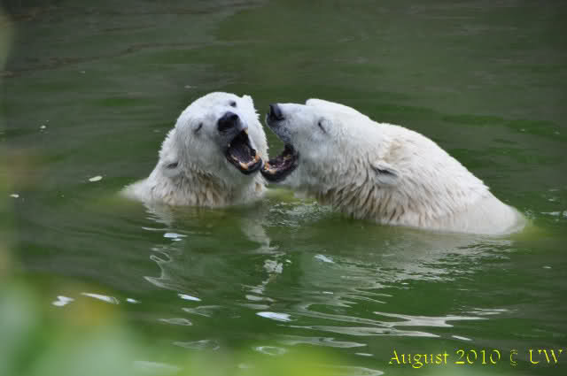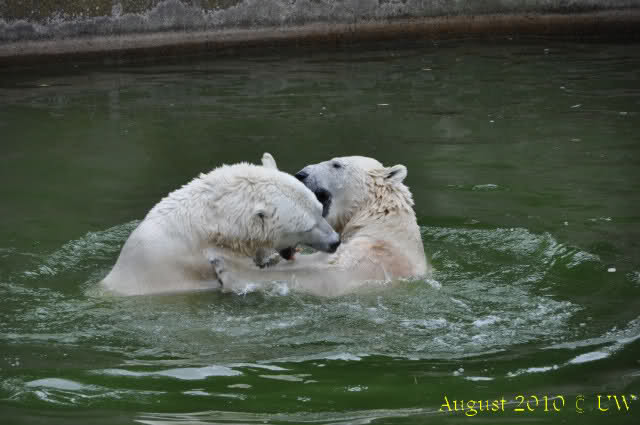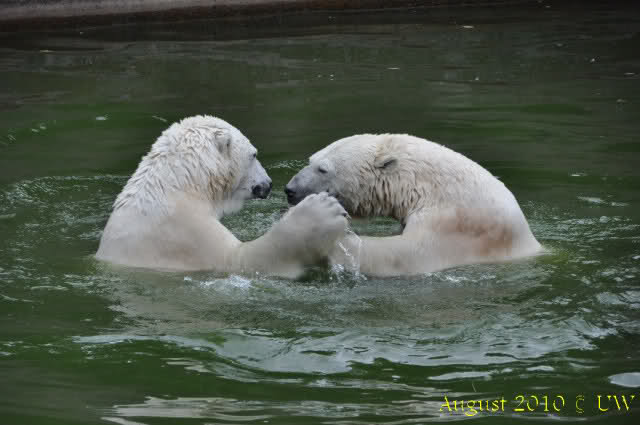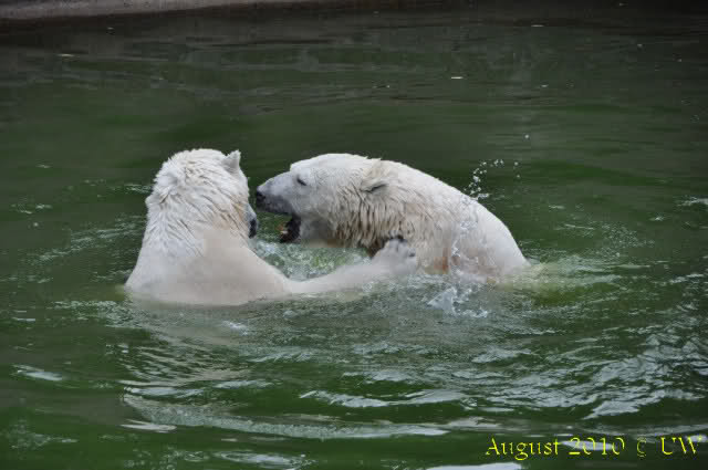 Die folgenden Bilder sind vor der Fütterung aufgenommen, die Bären spielten miteinander, holten sich herunterhängende Zweige und fanden im Wasser auch eine Kokosnuss.