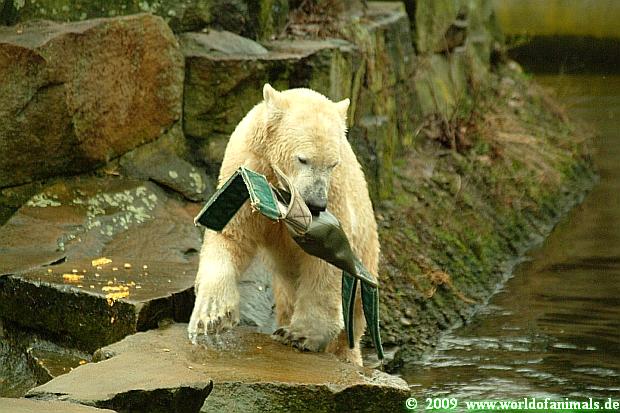 Die Fütterung von Knut machte heute Herr Röbke. Er verschaffte Knut wieder ordentlich Bewegung, warf das Futter hier- und dorthin. Knut ließ sich daraufhin ins Wasser krachen, dass es nur so spritzte. Die leckeren Dinge, wie Fleisch und Fisch, mussten sofort geholt und verspeist werden. Weniger interessante Dinge, so wie Äpfel, wurden zunächst mal ignoriert.