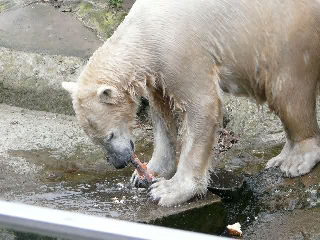 Die Fütterung machte heute Herr Röbke, der heute den ersten Tag nach dem Urlaub wieder auf Arbeit ist. Er kann ja sehr gut und weit werfen und servierte den Eisbärendamen das Fleisch fast mundgerecht. So wurden auch die beiden Wasserscheuen, Nancy und Katjuscha, satt.