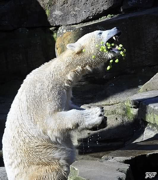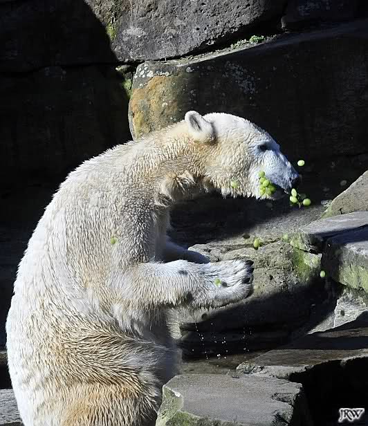 Knut sperrt seinen mächtigen Rachen auf, schnappt sich die Weintrauben, die ein Pfleger über den Gehegegraben geworfen hat.