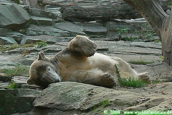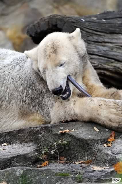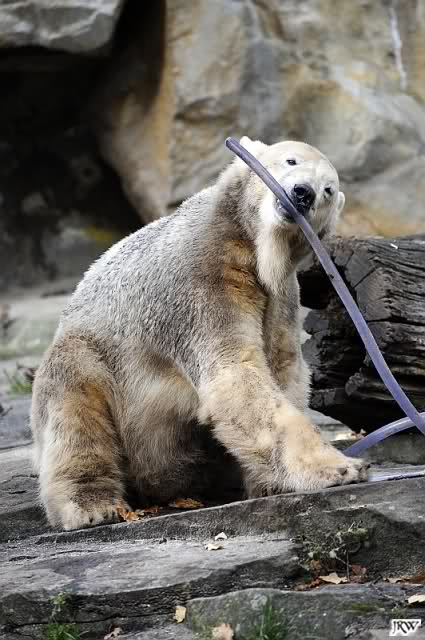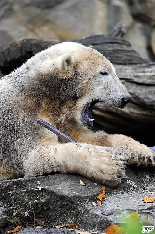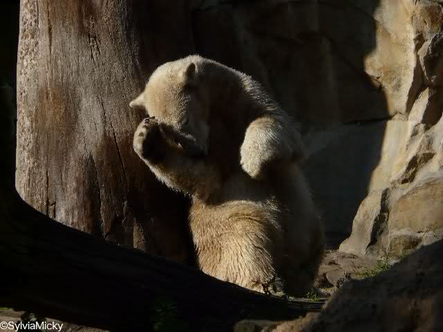 Mein langer Tag endete heute Nachmittag im Berliner Zoo bei Knut. Der Zoo war auch heute wieder sehr voll. Als ich gegen 16 Uhr in den Zoo kam, lag Knut vor seiner Höhle und wartete auf Einlass. Gegen 17 Uhr konnte er dann in seine Höhle, kam gegen 17:30 h wieder heraus, fischte sich noch aus dem kleinen Wasserbecken einen Rest Knochen heraus und war nur noch müde, suchte sich eine passende Schlafposition. Gerne hätte er wieder auf seinem geliebten Sandhaufen geschlafen, aber der war heute zu hoch aufgeschüttet, das Knut es vorzog sich auf den nackten Felsen niederzulegen...